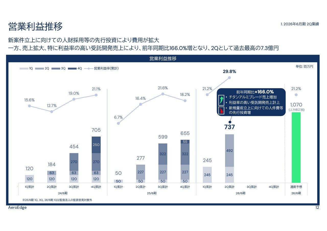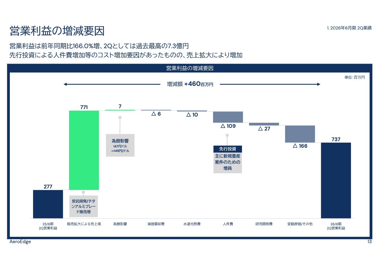 営業利益は、新規量産案件の立ち上げに向けた人件費の増加があったものの、チタンアルミブレードの売上増加や利益率の高い受託開発売上の計上により、前年同期比166.0パーセント増加し、こちらも過去最高の7億3,000万円となりました。