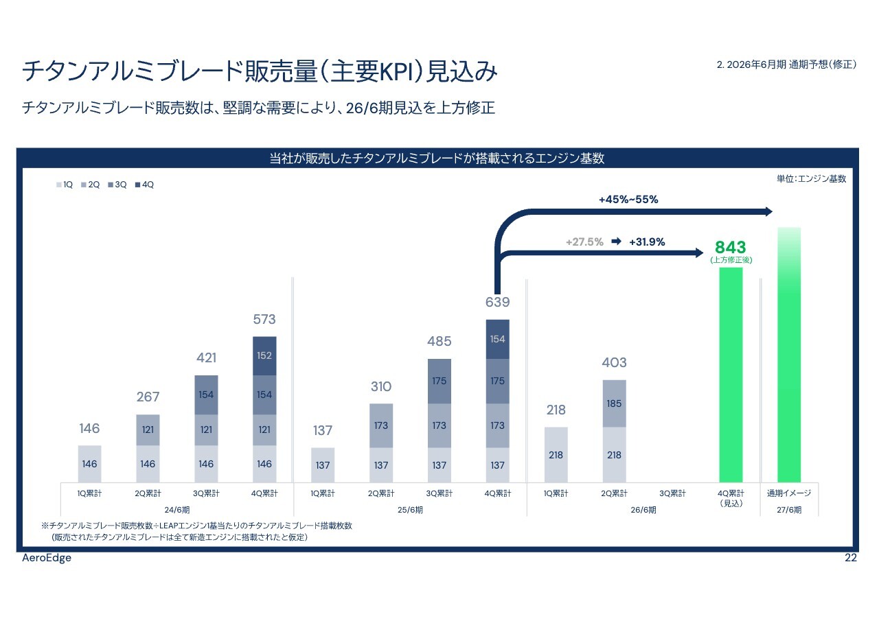 森西:2027年6月期のチタンアルミブレードの販売見込みは、2025年6月期と比較して45パーセントから55パーセント増加する見通しと、前回発表から据え置いています。