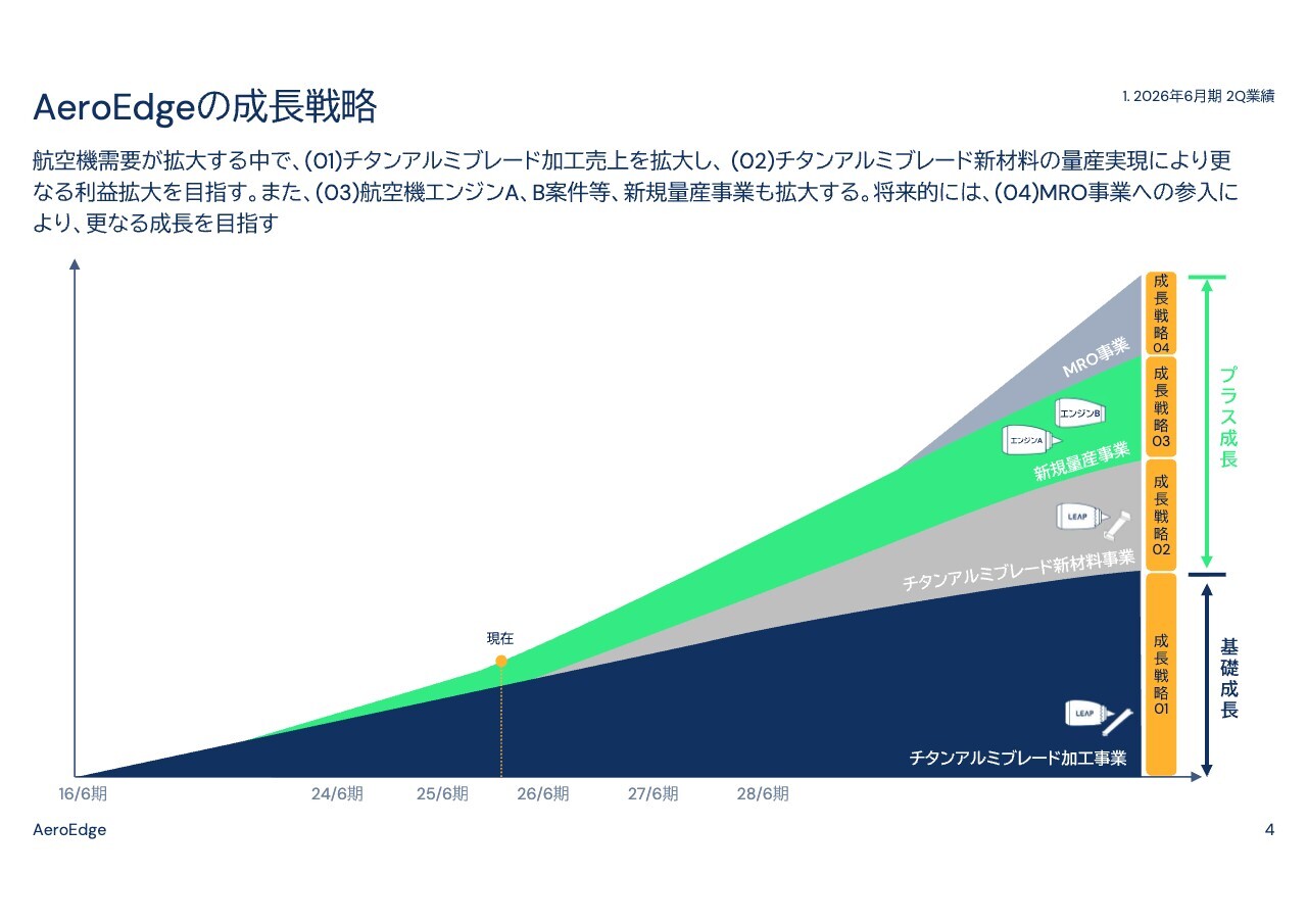 1つ目はチタンアルミブレード加工事業の拡大、2つ目はチタンアルミブレード新材料の量産供給、3つ目は新規量産事業の拡大、4つ目はMROビジネスへの進出です。MROビジネスは現在、技術開発段階ですので、1つ目から3つ目の状況についてそれぞれご説明します。