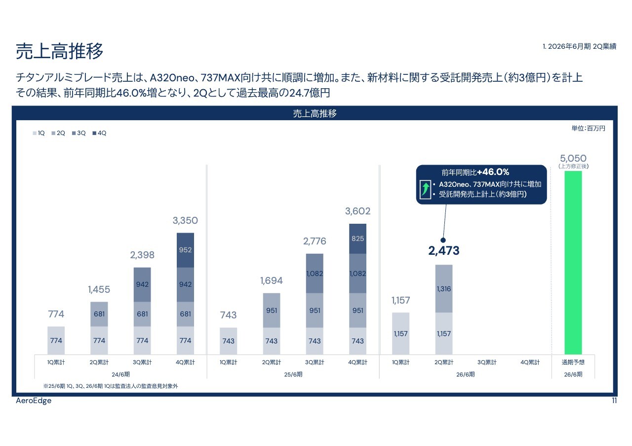 次に、業績概要についてご説明します。売上高は、チタンアルミブレードの販売増加および受託開発売上の計上により、前年同期比46.0パーセント増加し、第2四半期として過去最高の24億7,000万円となりました。