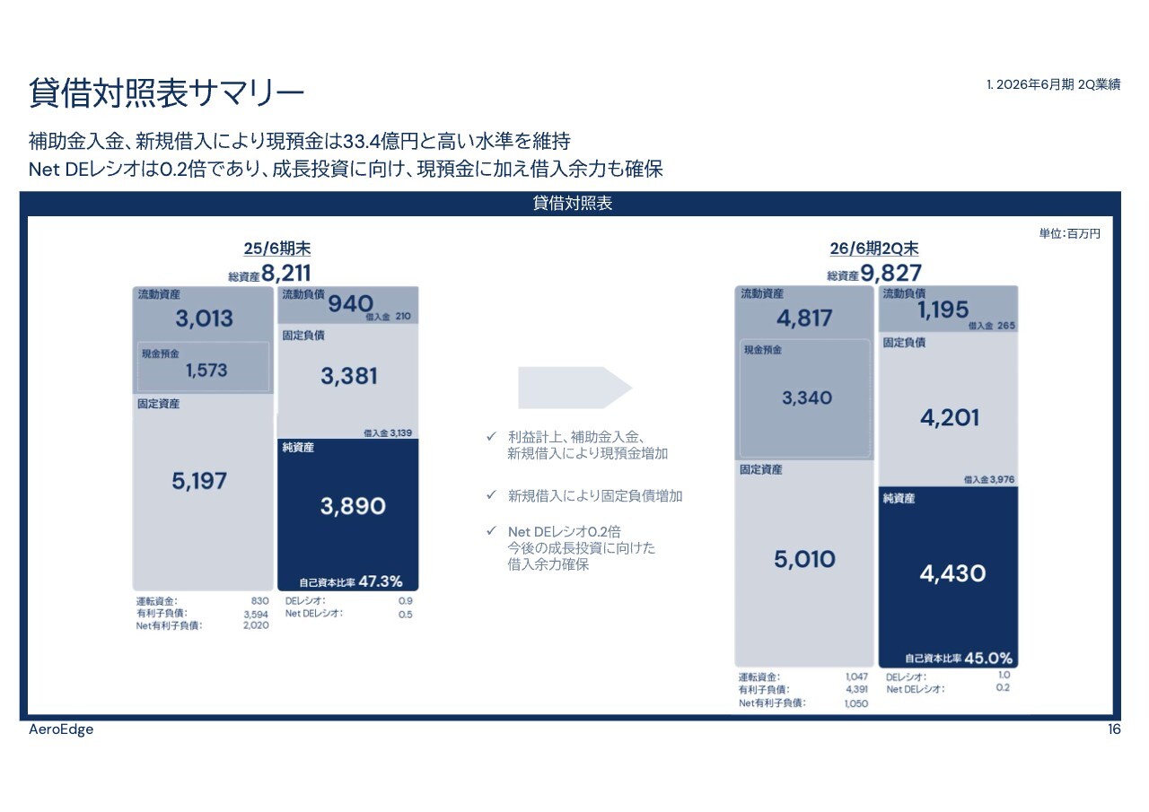 その結果、全体として固定資産の金額は減少しています。一方、設備投資に向けた新規借入や補助金の入金により、現預金は前期末から17億6,000万円増加し、33億4,000万円となり、かなり高い水準となっています。