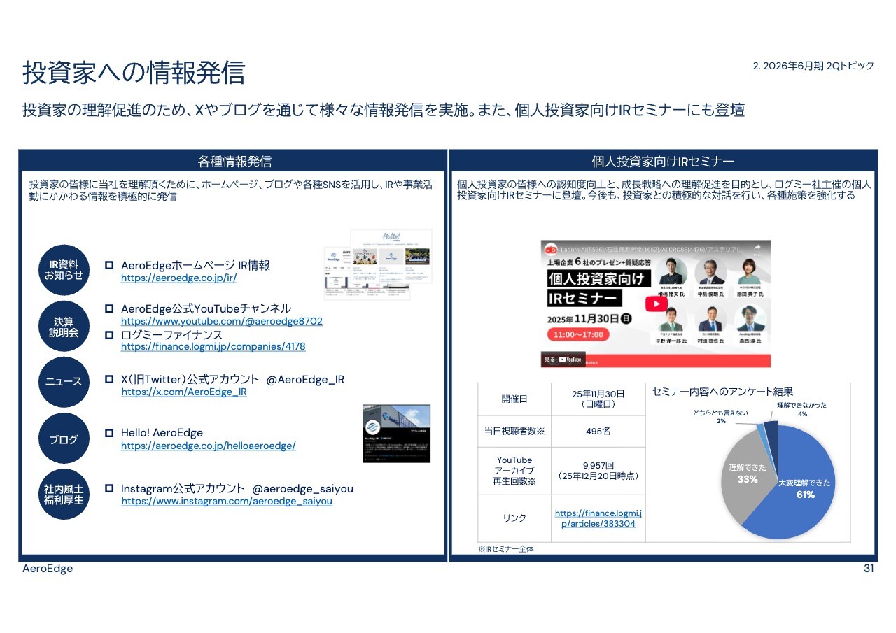 森西淳氏(以下、森西):本日はお忙しい中、AeroEdge株式会社の2026年6月期第2四半期決算説明会にお集まりいただき、誠にありがとうございます。AeroEdge株式会社代表取締役社長兼執行役員CEOの森西淳です。