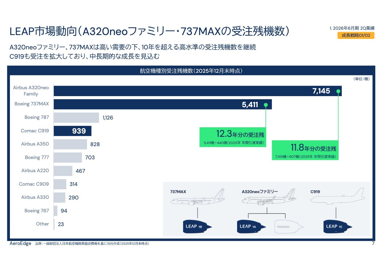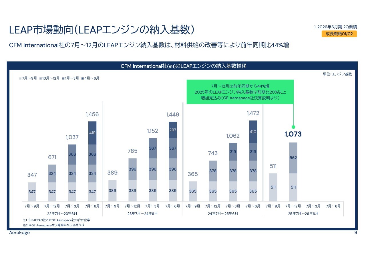 「LEAP」エンジンの生産数と当社の販売数には高い相関関係があります。「LEAP」エンジンの2025年7月から12月の納入基数は1,073基で、前年同期の743基から約44パーセント増加しました。