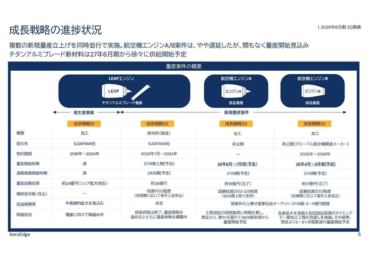 この航空機エンジンA部品およびB部品の合計で、2027年6月期に3億円から5億円の営業利益拡大を目指しています。やや遅れは出ましたが、現時点でこの目標に変更はありません。なお、売上規模としては、航空機エンジンB部品のほうが大きくなると考えています。