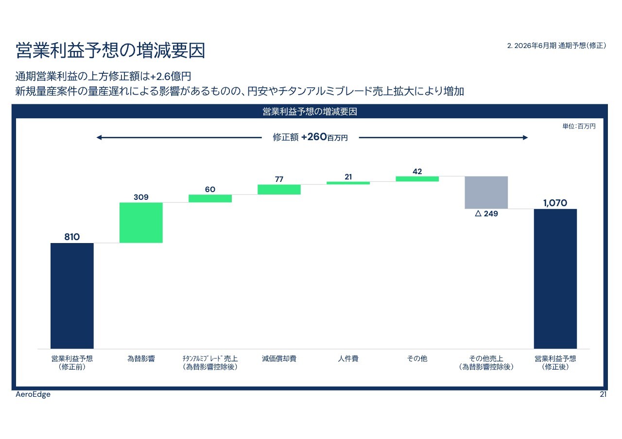 前年同期と比較した営業利益の増減要因についてご説明します。営業利益は前年同期の2億7,000万円から7億3,000万円となり、4億6,000万円増加しました。主な増加要因は、チタンアルミブレードの販売増加と受託開発売上によるもので、売上ベースでは7億7,000万円となっています。為替の影響については、平均取り込み為替レートが前期と大きな差がないため、限定的でした。