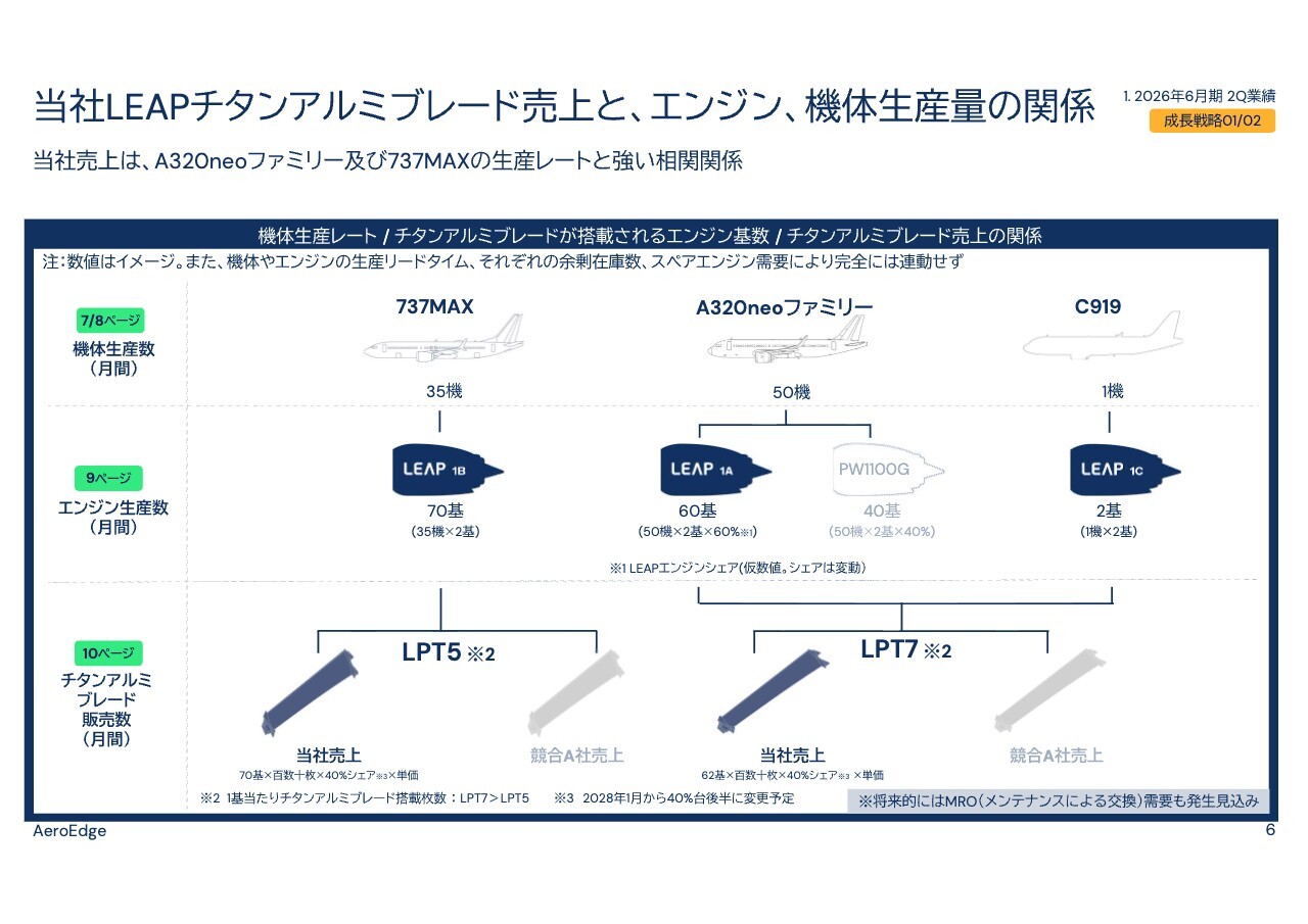 スライドの表に記載のとおり、当社のチタンアルミブレードの売上は、航空機機体である「A320neo」ファミリーおよび「737MAX」の生産、およびそれに搭載される「LEAP」エンジンの生産と強い相関関係があります。