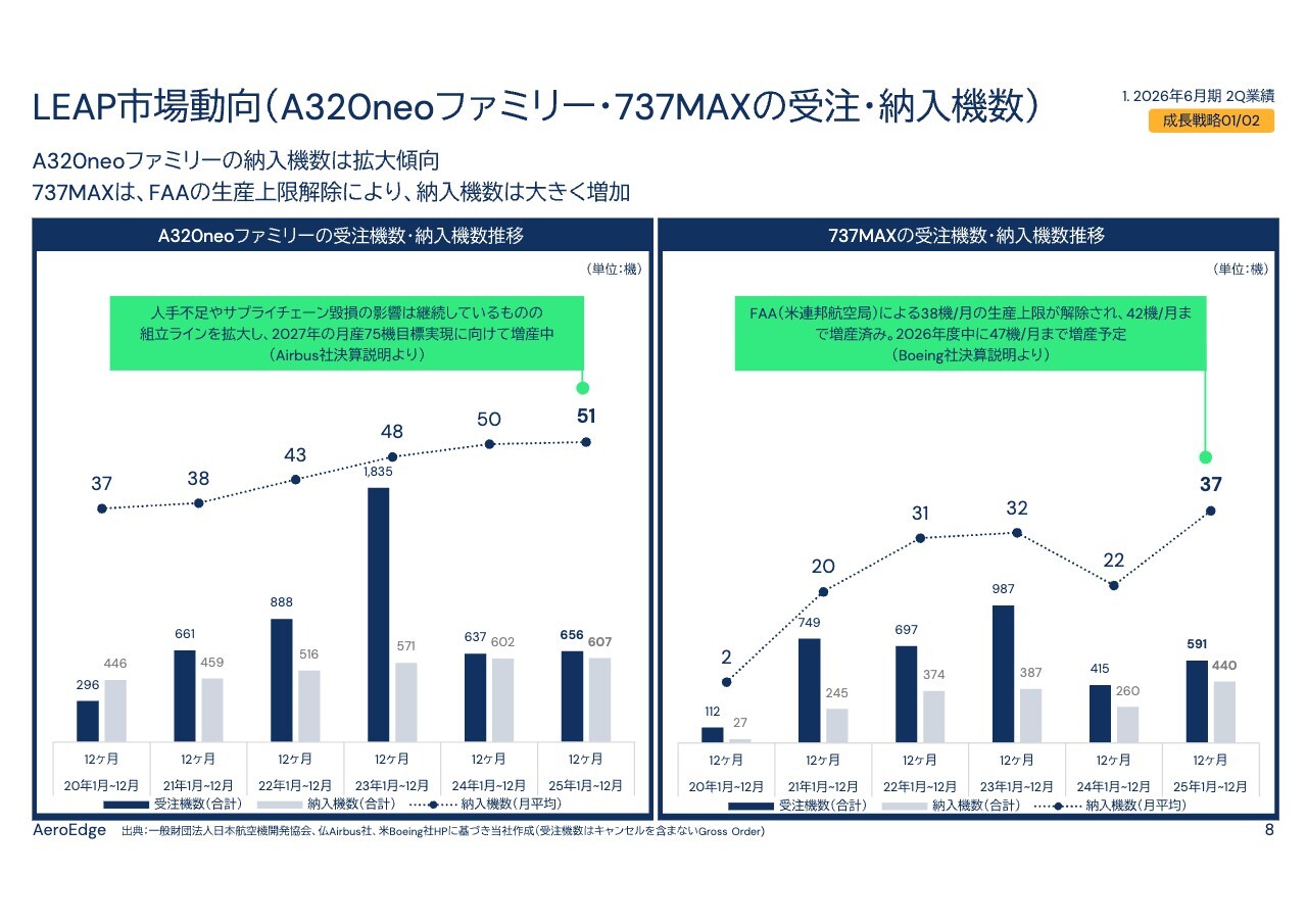 まず、市場環境についてです。当社の主要製品であるチタンアルミブレードが搭載されるAirbus社製「A320neo」ファミリーおよびBoeing社製「737MAX」は、航空機需要の拡大により、受注残が引き続き高水準を維持しました。