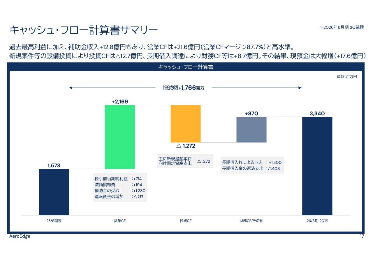 最後に、キャッシュ・フローについてです。営業キャッシュ・フローは、売上拡大に伴う運転資金の増加がありましたが、利益の拡大や12億8,000万円の補助金の入金により、21億6,000万円のプラスと高い水準を確保しました。