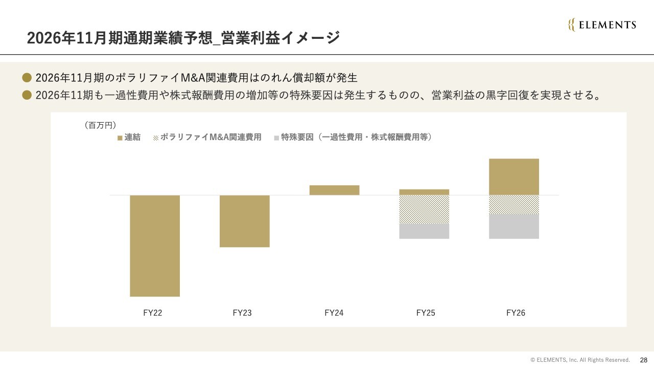 スライドのグラフの斜線部分でお示ししたように、2026年11月期もポラリファイ社M&A関連費用として、のれん償却額が発生します。その他にも一過性費用や株式報酬費用などの特殊要因も発生します。一過性費用は2025年度と比較してさらに大きくなる見込みですが、それを含めても、2026年度の最終的な連結営業利益は、必ず黒字化を達成することをお約束します。