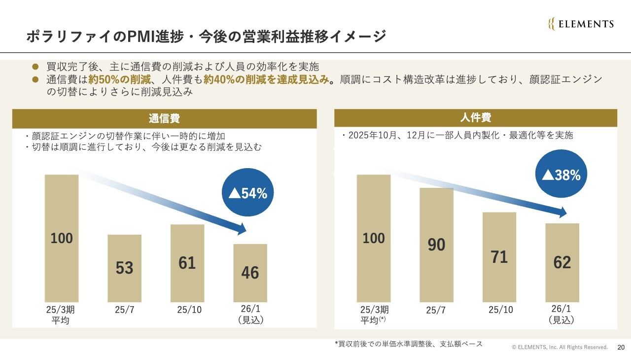 通信費は、買収前の通期平均と比較して、すでに50パーセントの削減を実現しています。また、顔認証エンジンの切り替えも順調に進んでおり、さらなる削減が見込まれます。