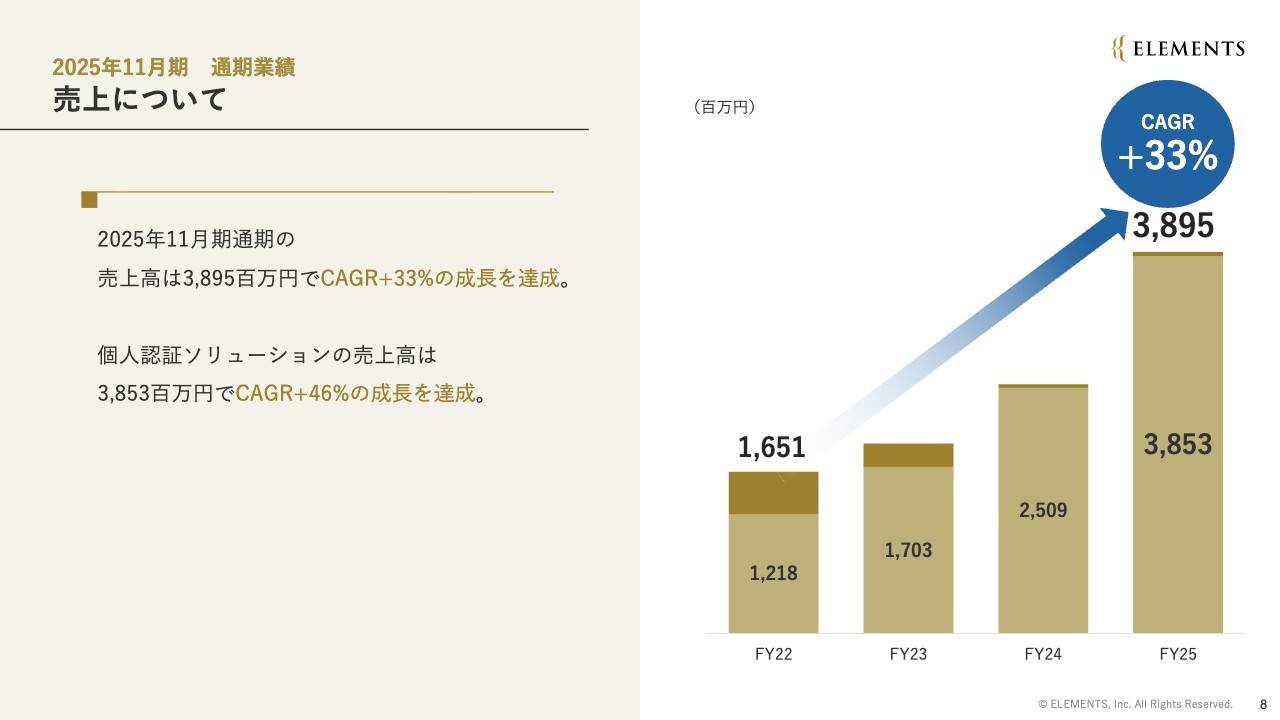 通期の売上です。2025年11月期通期の売上は38億9,500万円で、CAGRはプラス33パーセントの成長を達成しました。