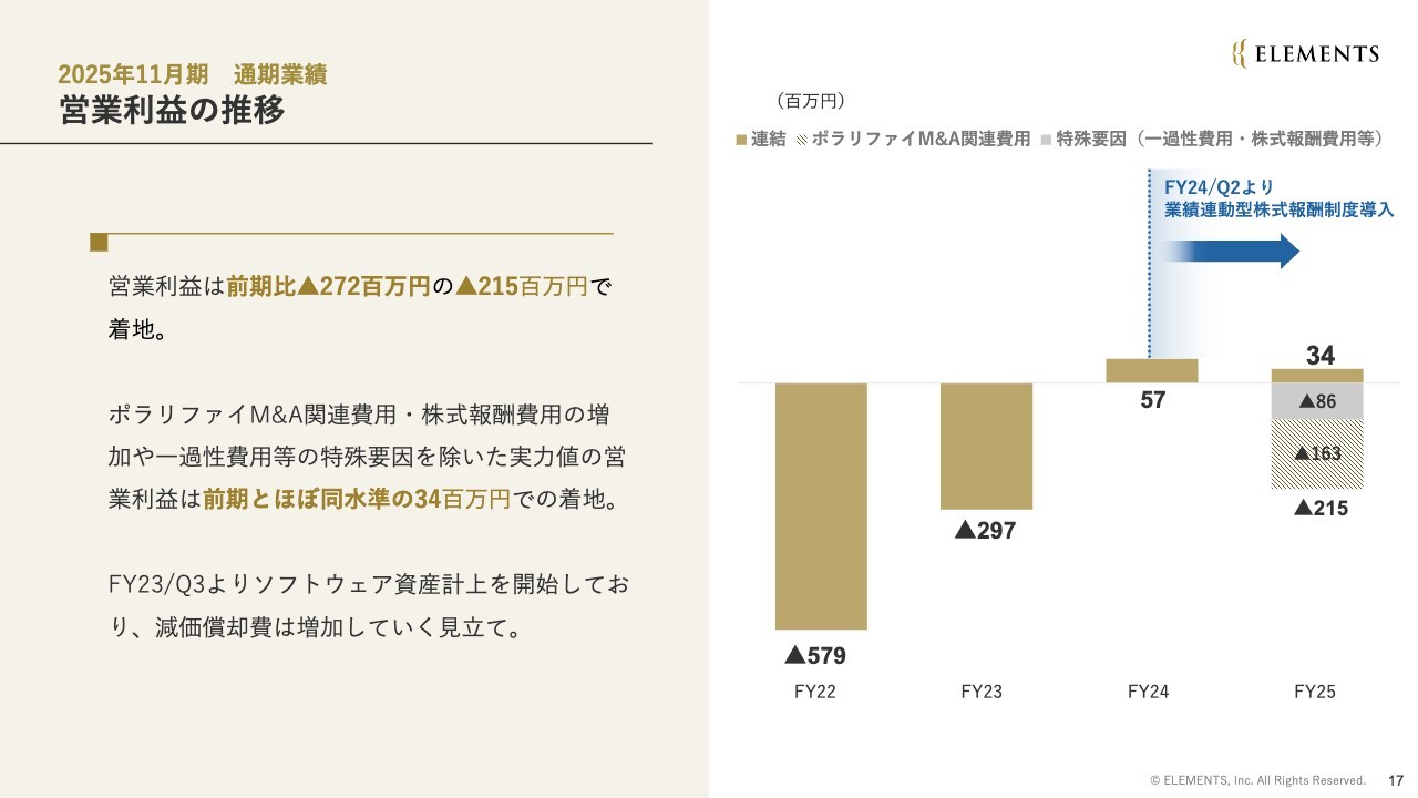 一方で、ポラリファイ社連結化に伴い費用が増加した結果、営業利益は2億1,500万円の赤字となりました。ただし、ポラリファイ社M&A関連費用や一過性費用、株式報酬費用の増加などの特殊要因を除いた場合、営業利益は3,400万円の黒字となり、前期とほぼ同水準です。