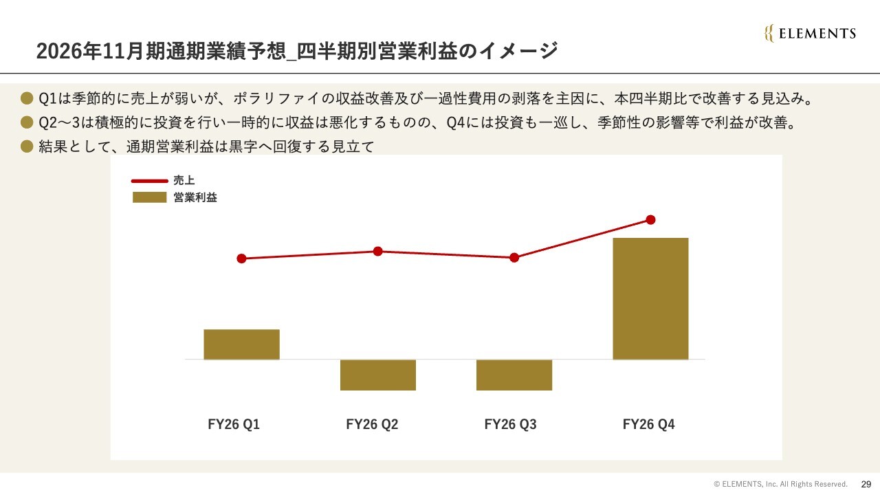 2026年11月期の営業利益は黒字化を目指してゼロから2億円という幅の業績予想を出しましたが、2026年第1四半期は、シーズナリティ(季節性)の影響で売上規模が大きくないものの、ポラリファイ社の収益改善や一過性費用の剥落が主因となり、前四半期比で改善する見込みです。