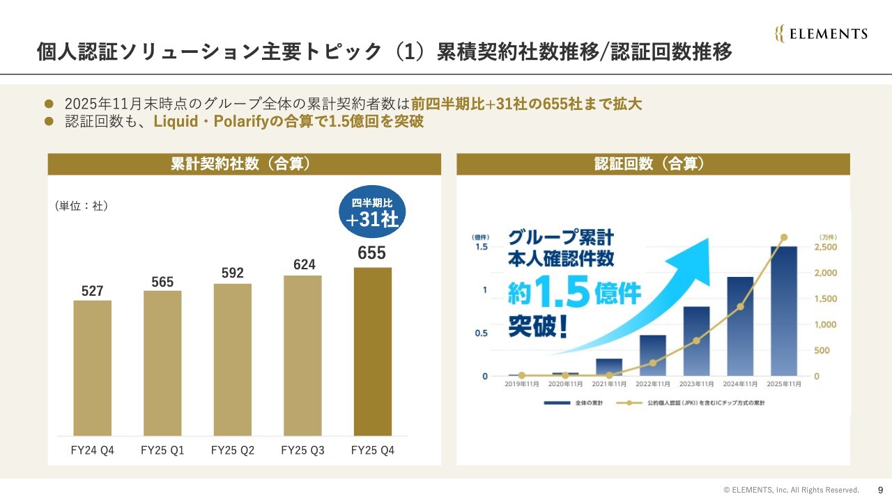 前四半期から31社増加して655社となり、堅調に増加しています。また、認証回数もLiquid社とポラリファイ社の合算で1億5,000万回を突破し、堅調に推移しています。