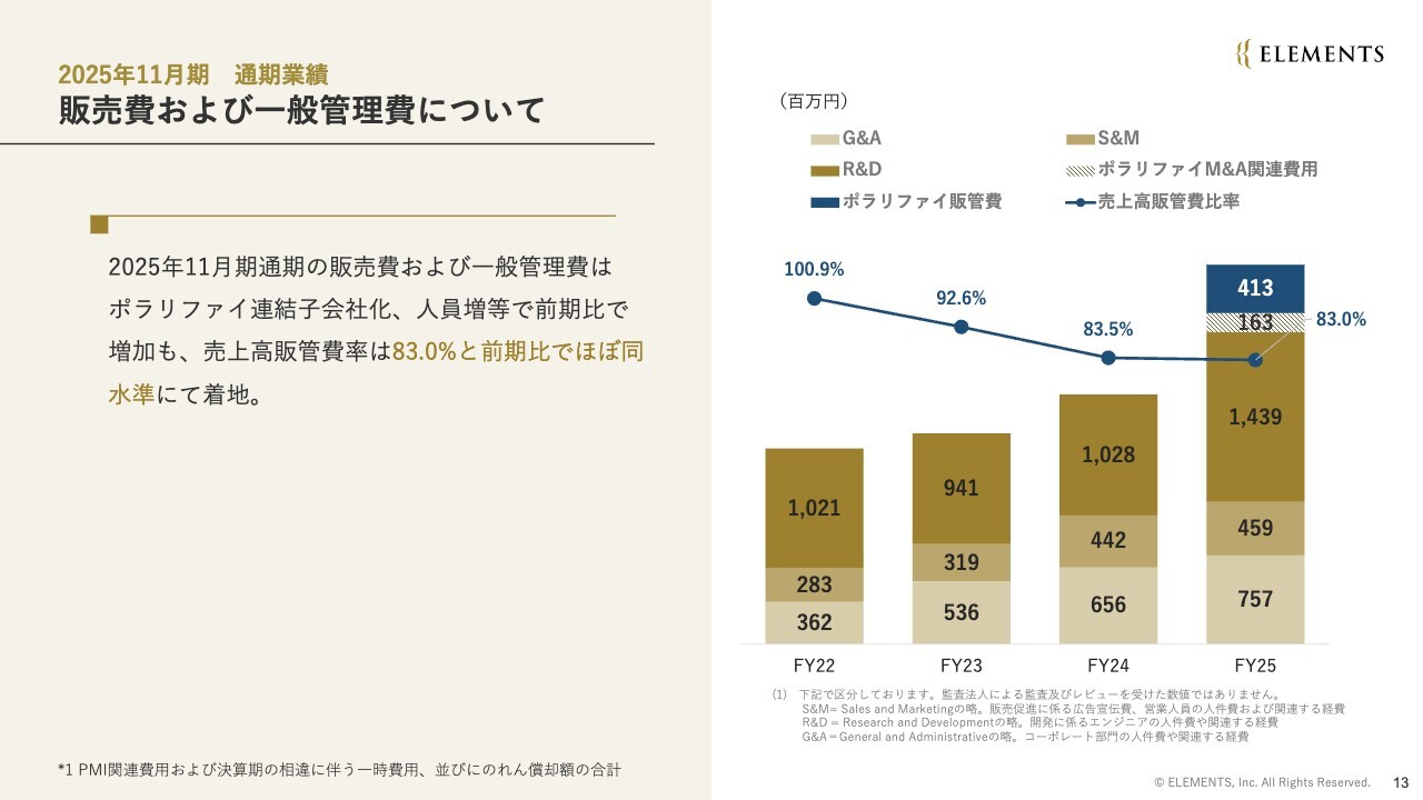 通期の販管費および一般管理費は32億3,300万円となりました。ポラリファイ社連結化に伴う一過性費用や株式報酬費用の増加などの影響を受け、前期比で11億円増加しています。
