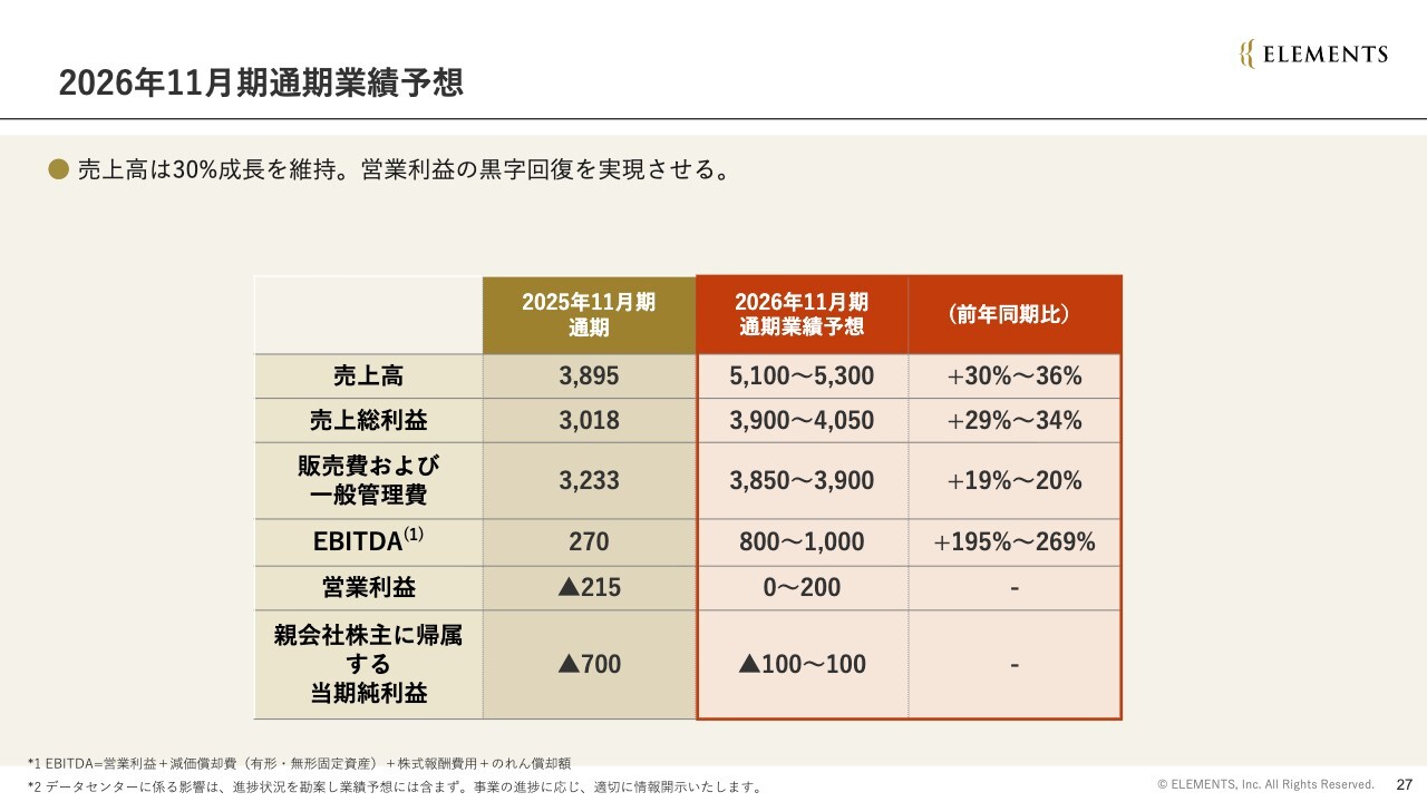売上高の成長率は前期比で30パーセントから36パーセントを見込んでいます。販売費および一般管理費の増加は20パーセント以下に抑える予定です。EBITDAは約200パーセントの増益を予定しています。営業利益は2026年度の黒字化必達をお約束します。上限は2億円です。