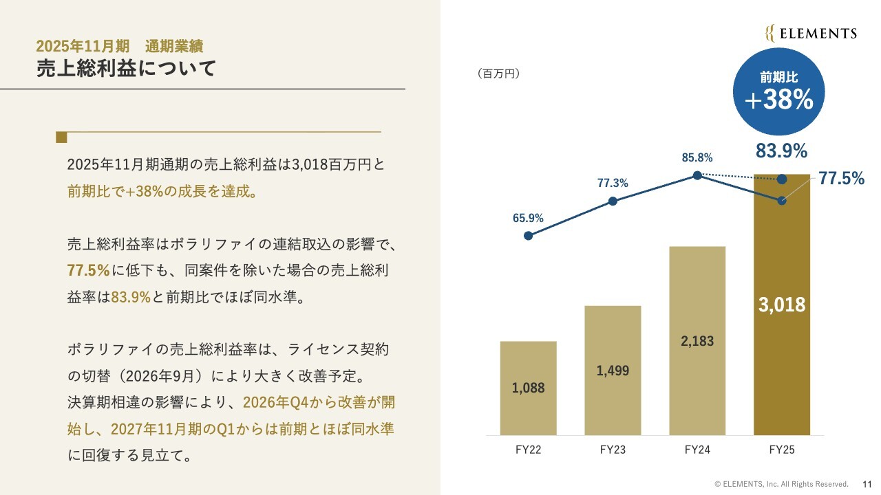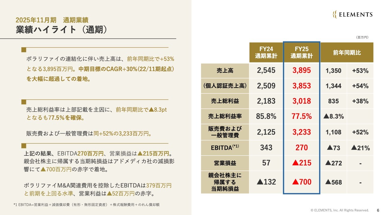 長谷川敬起氏:みなさま、こんにちは。株式会社ELEMENTS代表取締役社長の長谷川です。本日はお忙しい中、当社の決算発表にお越しいただき、誠にありがとうございます。これより、株式会社ELEMENTSの2025年11月期第4四半期および通期決算説明を開始します。