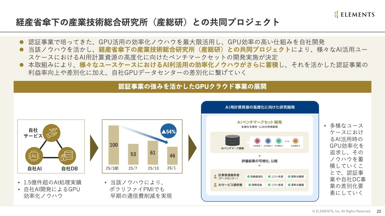 さらに、自社のGPUデータセンター「ELEMENTS CLOUD」の差別化にもこのノウハウを活用したいと考えています。