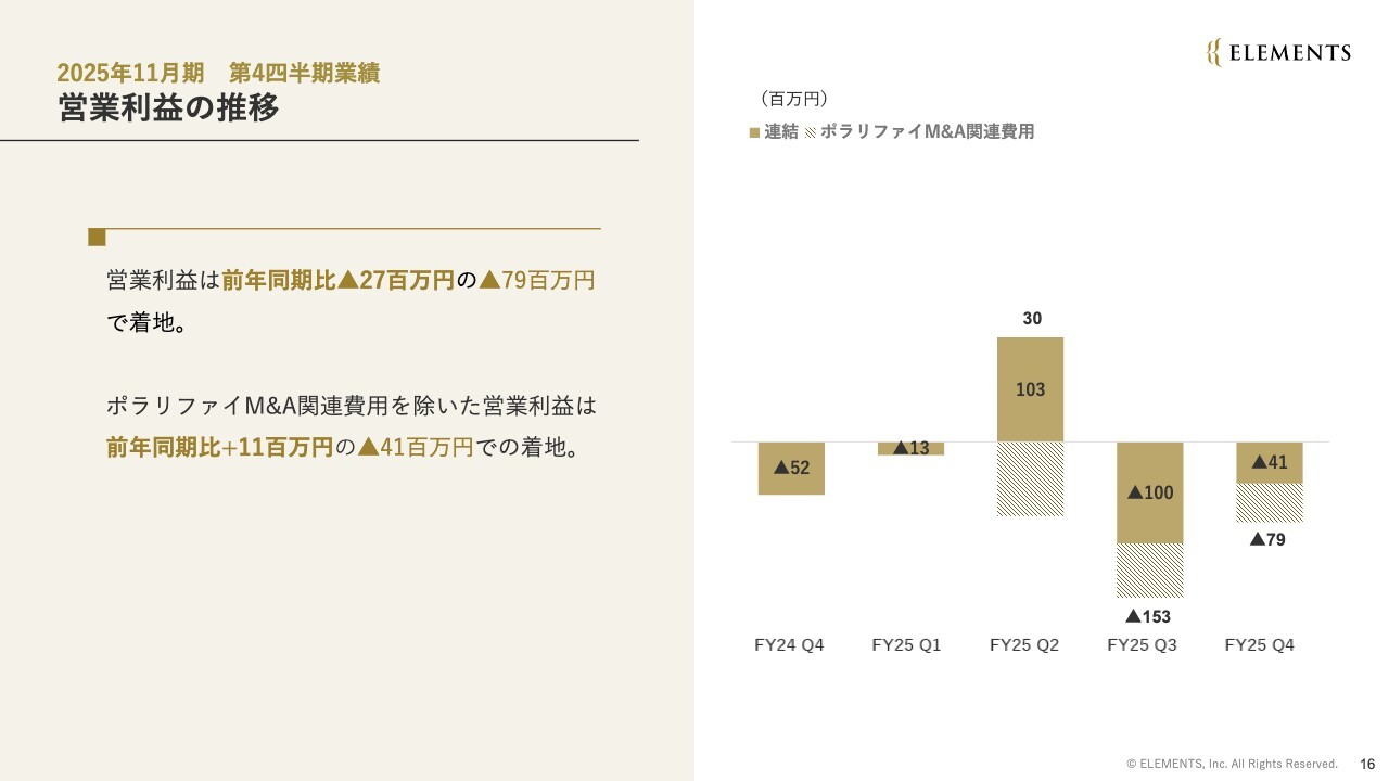 四半期ごとの営業利益です。7,900万円の赤字で着地しましたが、ポラリファイ社M&A関連費用を除いた数値では4,100万円の赤字となり、前年同期比でほぼ同水準です。