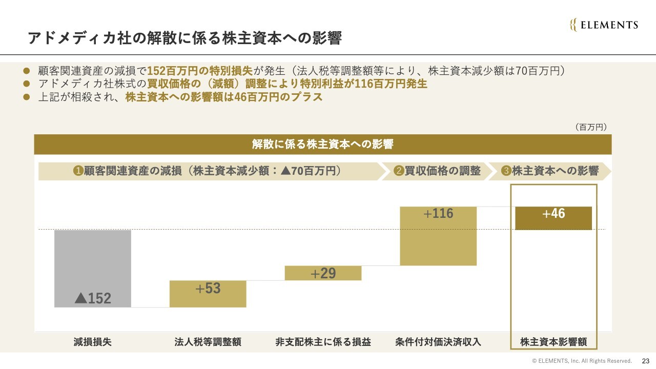 本決定に伴う株主資本への影響として、顧客関連資産の減損により1億5,200万円の特別損失が発生しました。また、一方でアドメディカ社株式の買収価格の減額調整により、特別利益が1億1,600万円発生しました。