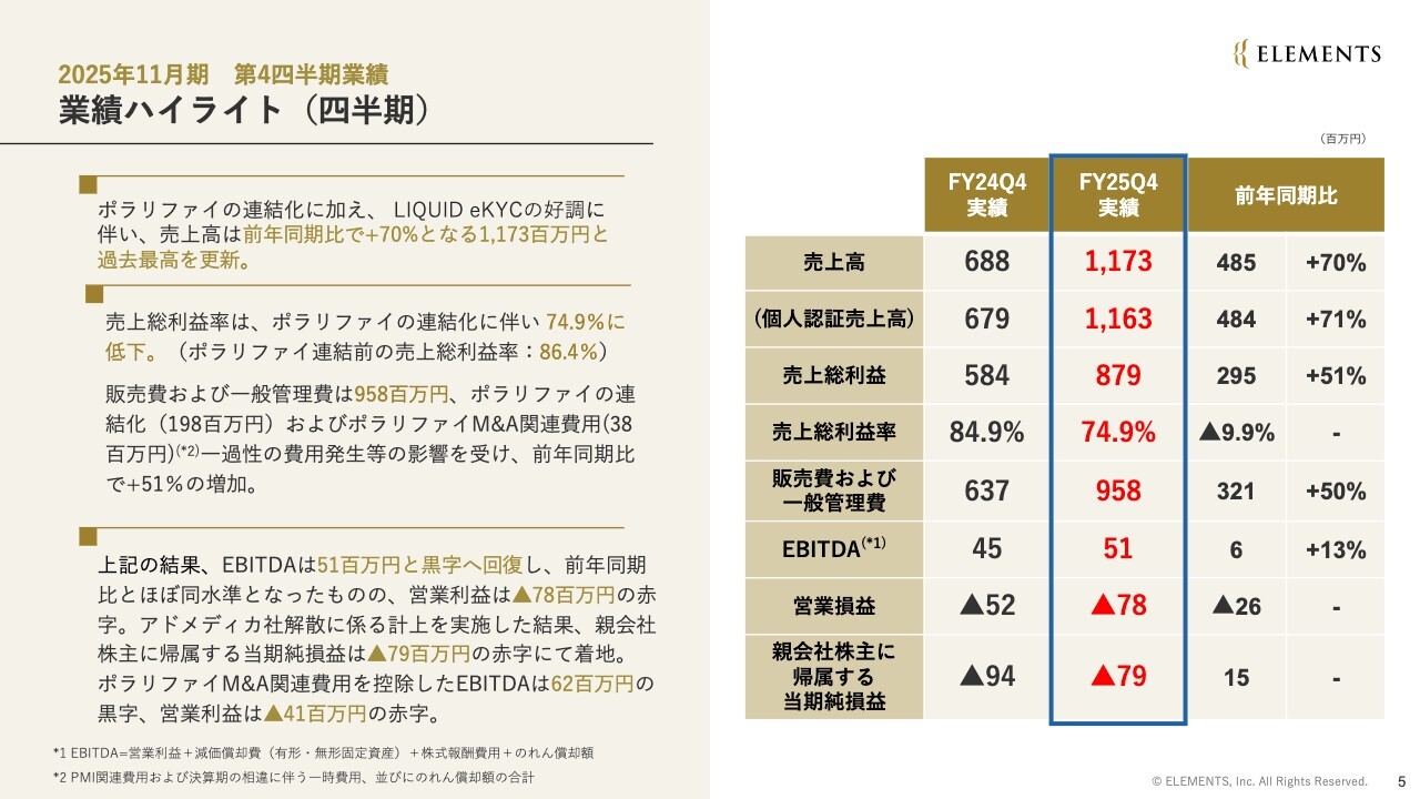 業績ハイライトについてご説明します。まず、第4四半期の財務数値の詳細についてです。売上高は、ポラリファイ社の連結開始効果もあり、11億7,300万円で前年同期比70パーセント増となっています。