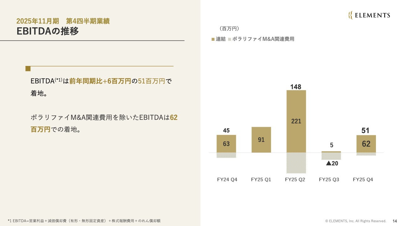 営業利益はポラリファイ社の影響により7,800万円の赤字となりましたが、EBITDAは5,100万円と黒字での着地となりました。