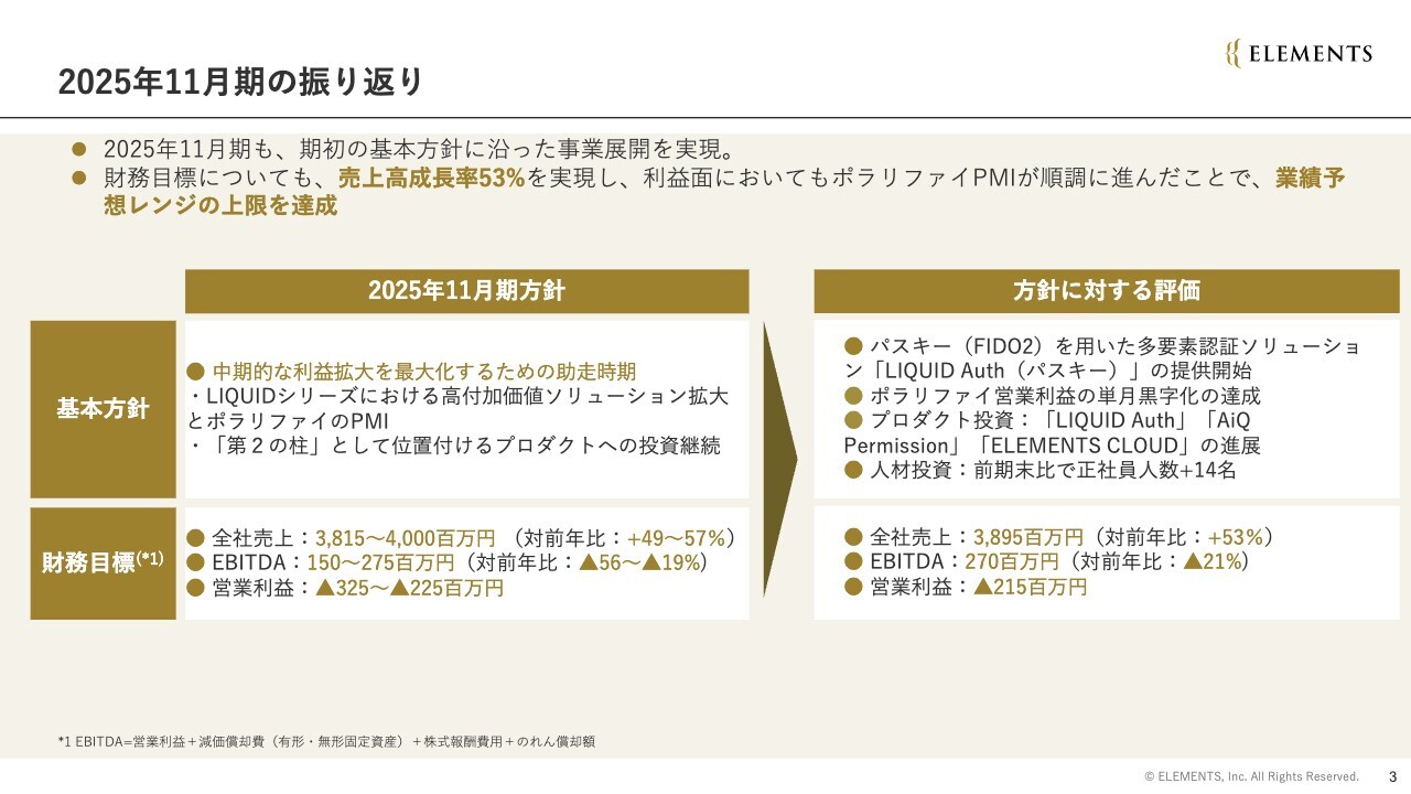 2025年11月期の振り返りです。2025年11月期は期初に掲げた基本方針に沿った事業展開を実現しました。