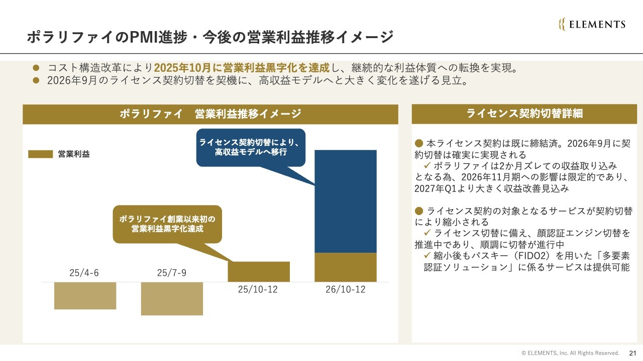 ポラリファイ社の売上総利益は、2026年9月にライセンス契約の切替実施が決定しており、これ以降さらなる大きな改善が見込まれています。