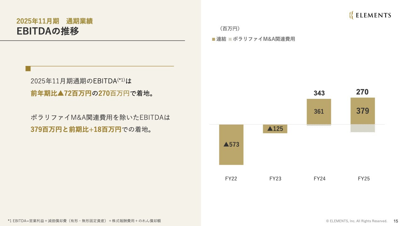 通期のEBITDAです。前期比で7,200万円減少し、2億7,000万円となりました。ただし、ポラリファイ社のM&A関連費用を除いた場合のEBITDAは3億7,900万円で、前期と同水準を維持しています。