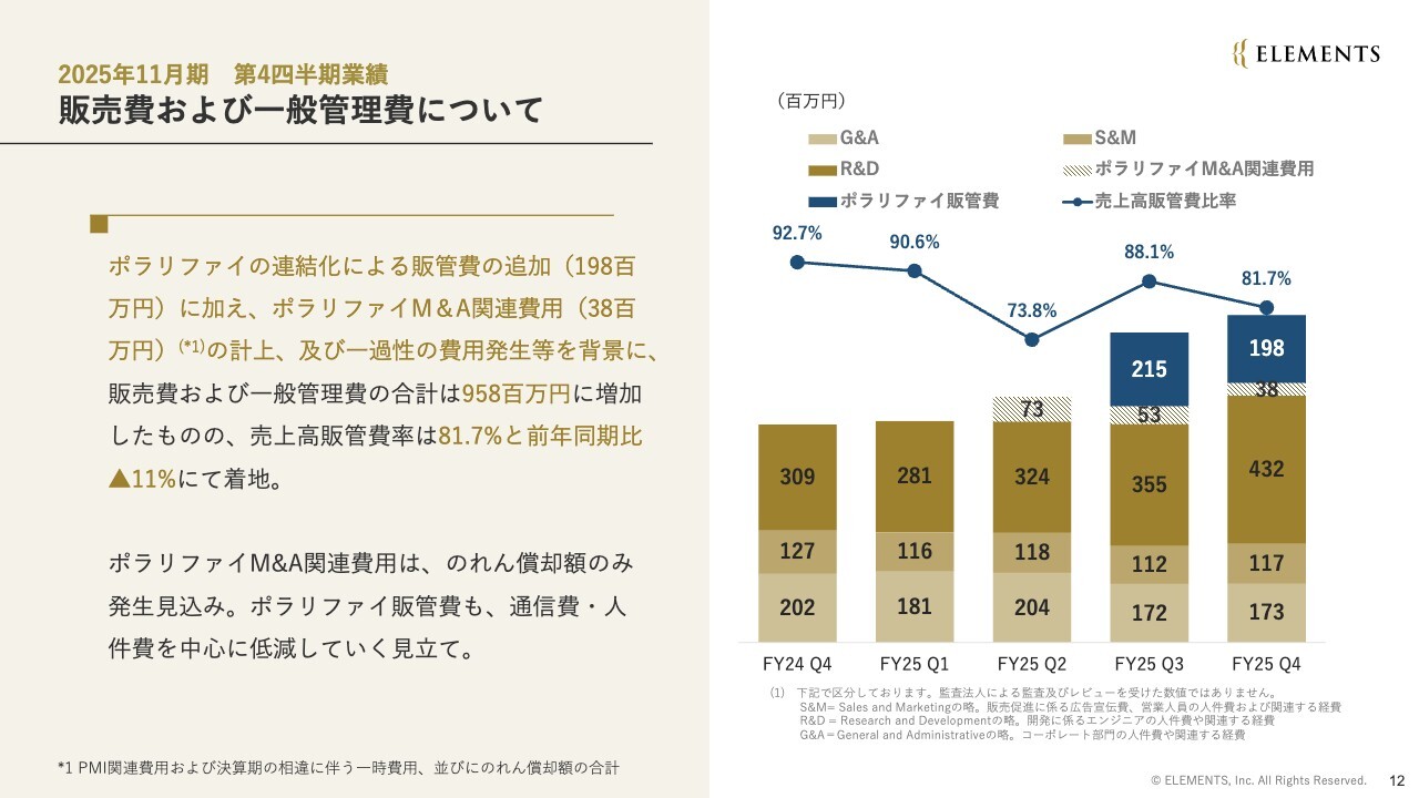 四半期ごとの販管費および一般管理費です。前四半期比5,100万円増加し、9億5,800万円で着地しました。ここでは、ポラリファイ社の影響の有無についても併せてお話しします。