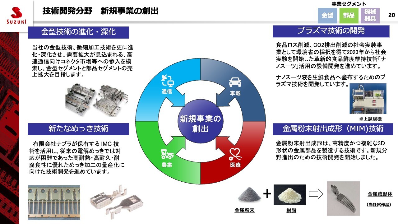 特に部品セグメントでは、スマートフォン向けの既存製品のシェアを維持させるとともに、自動車部品(特に電池部品)への継続的な事業活動を通じて、利益率の向上を図っていきます。また、新たなめっき加工技術を研究開発し、新規事業領域への参入を目指します。