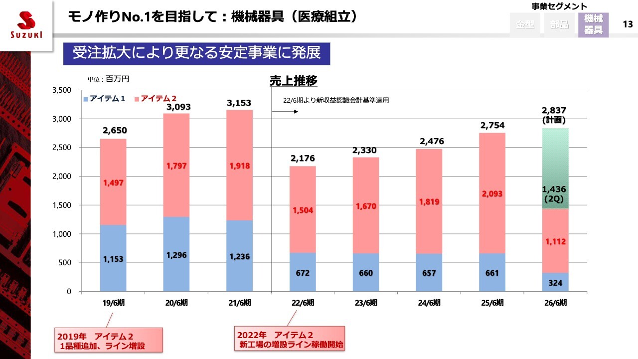 次に機械器具セグメントの医療器具組立についてです。これまでの売上の推移を表しています。アイテム2の増産計画は計画どおり進捗し、売上高は前期と比べ7.6パーセント増加の14億3,600万円となりました。通期では28億3,700万円を計画します。