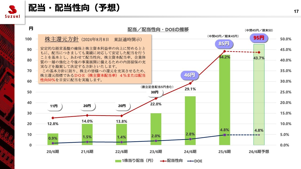 その上で、今後当社の企業価値を高めていくためには株主還元の重要度が増していることを踏まえ、2026年6月期の1株当たり配当予想を中間45円、期末50円の年間95円とします。年間配当95円とした場合、配当性向は43.7パーセント、DOEは4.8パーセントを想定し、先日公表した株主還元方針に基づいたものになります。