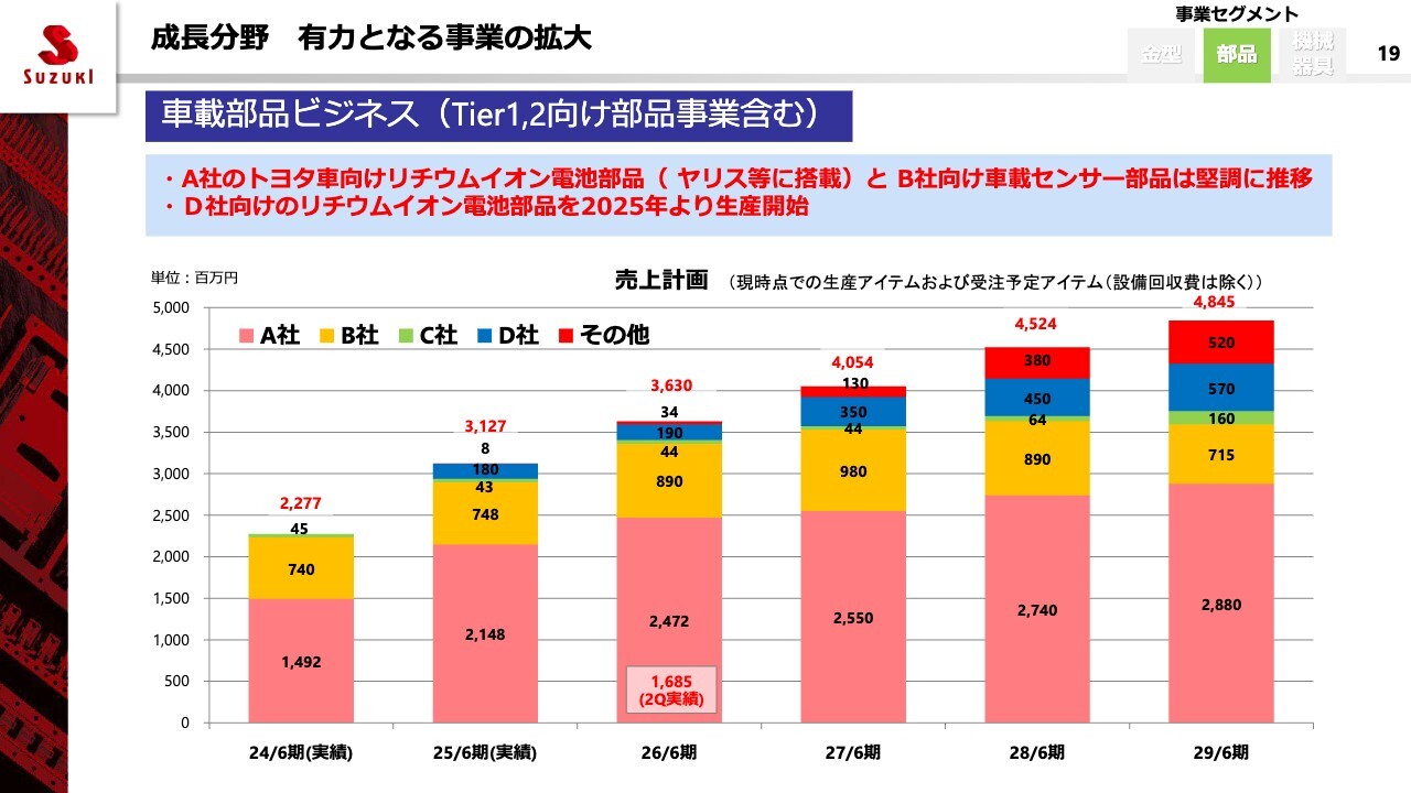 鈴木:続いて、当社の中期経営計画について概要をご説明します。現在の事業の中で3ヶ年の間で拡大を目指すセグメントは、部品セグメントと機械器具セグメントとなります。
