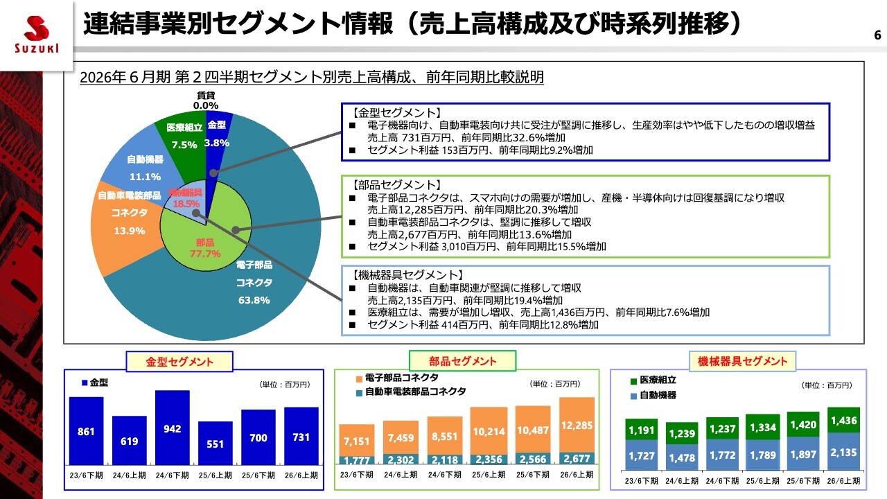 部品セグメントは、電子部品コネクタでは、スマートフォン向けが堅調に推移しました。また、産機向けや半導体向けが復調してきました。自動車電装部品コネクタは堅調で、売上高は前期と比べ13.6パーセント増加し、26億7,700万円となりました。