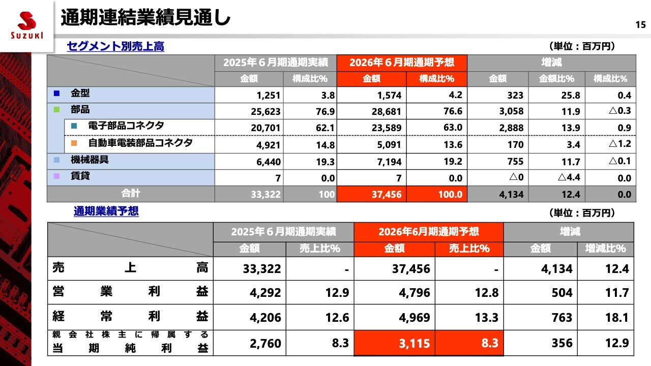 まず、2026年6月期通期のセグメント別売上高についてですが、金型セグメントではグループ内の金型の更新型、自動車向け外販型およびスマホ生産向け社内試作型を中心に前期と比べ25.8パーセント増を見込んでいます。