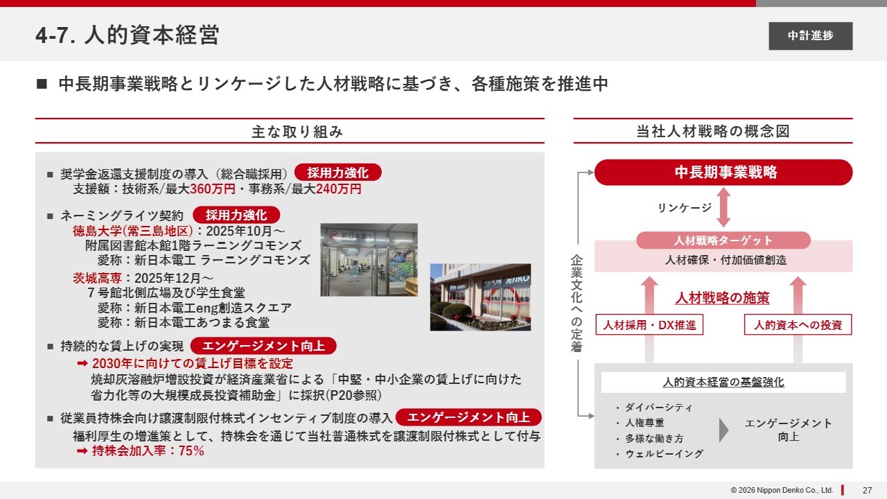 人的資本経営です。こちらも多くの進展がありました。採用力の強化について、直近の取り組みは、奨学金返還支援制度の導入です。この制度は、奨学金の返済が必要な状態で卒業し、入社した方に対して、記載の金額を会社が肩代わりするという内容です。