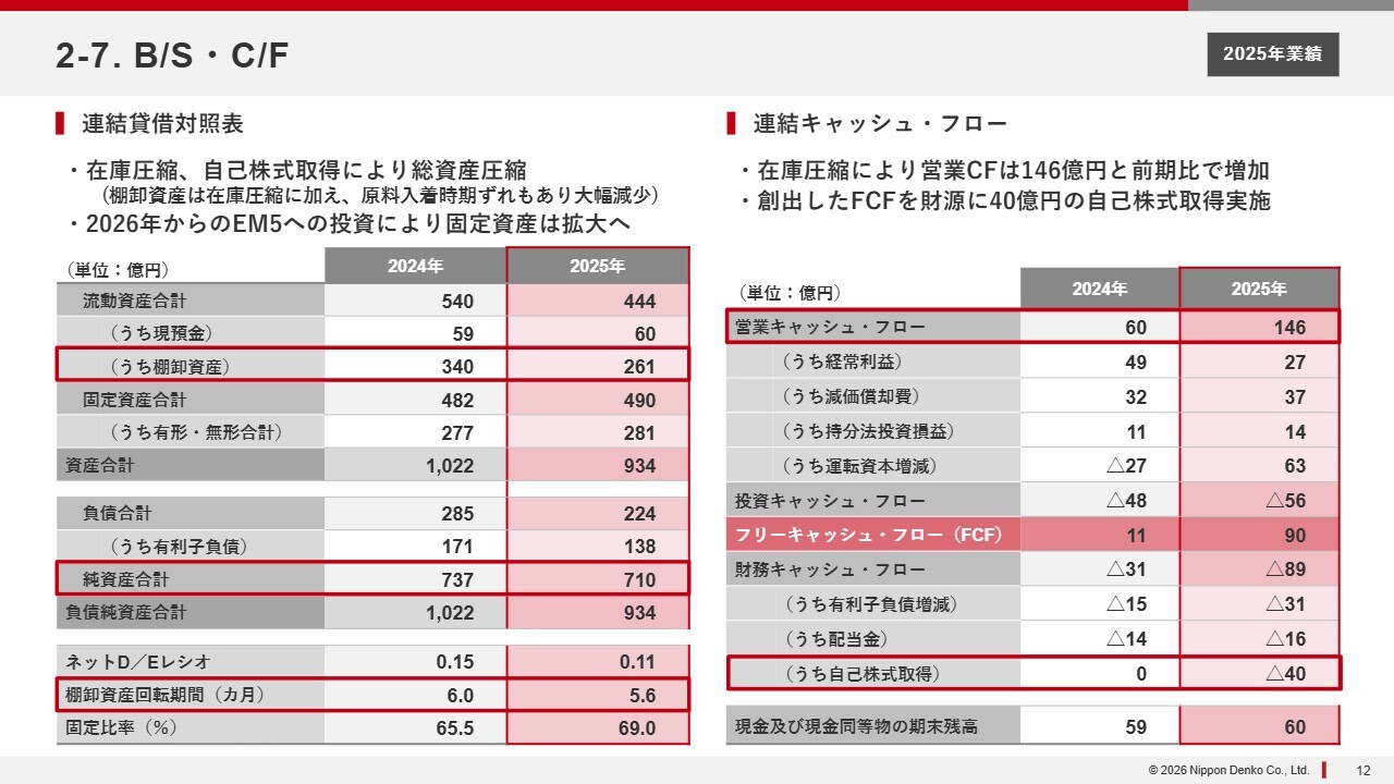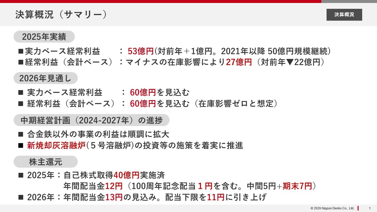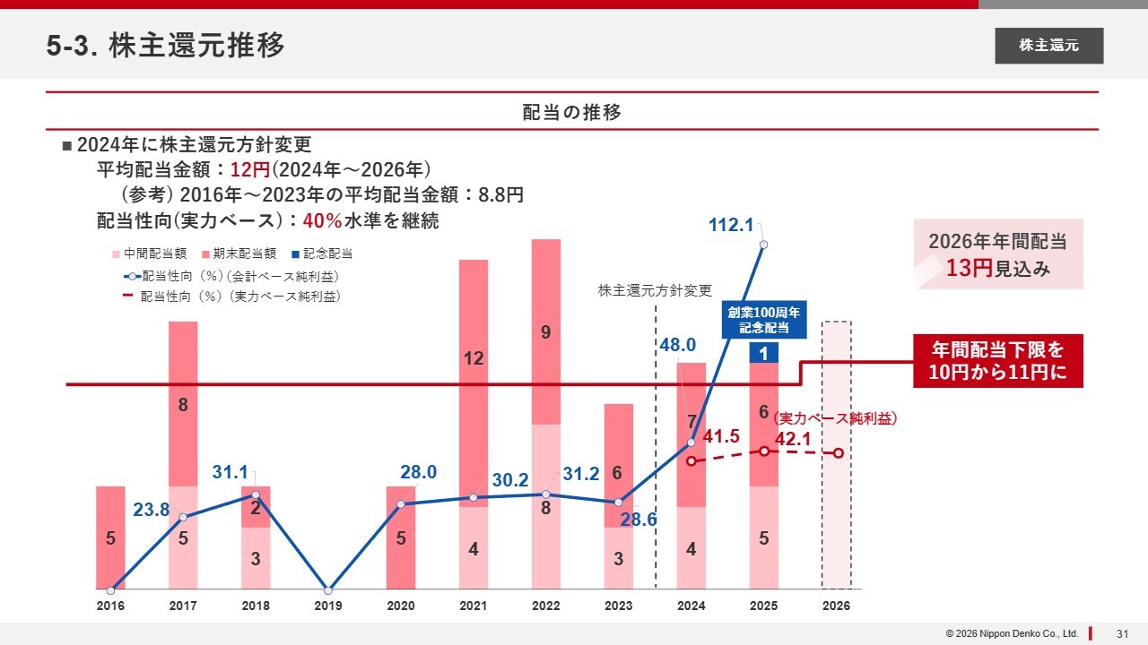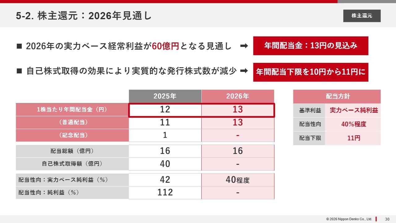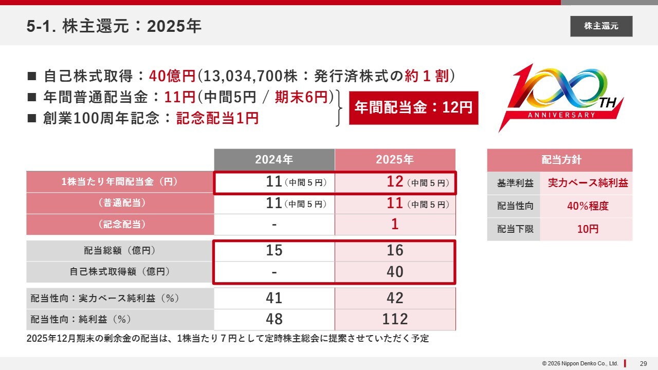 また、2025年の年間配当金を12円と確定しました。これは、中間配当5円に対し、期末配当7円という内訳で、2025年の創業100周年を記念し、記念配当の1円を含む12円というかたちで決定しました。2026年の年間配当金については、60億円が前提のため13円としています。