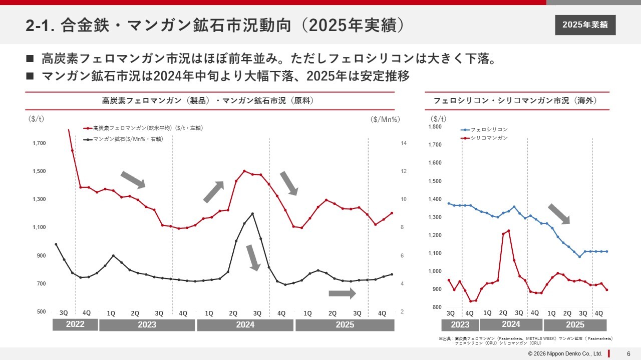 このような外部環境の中、当社の状況をお話しします。合金鉄事業に関しては、世界的な鉄鋼マーケットが弱いことに伴い、合金鉄の原料市場もあまり強くなく、ある意味では安定しています。そのため、2026年は在庫影響が解消される見込みです。