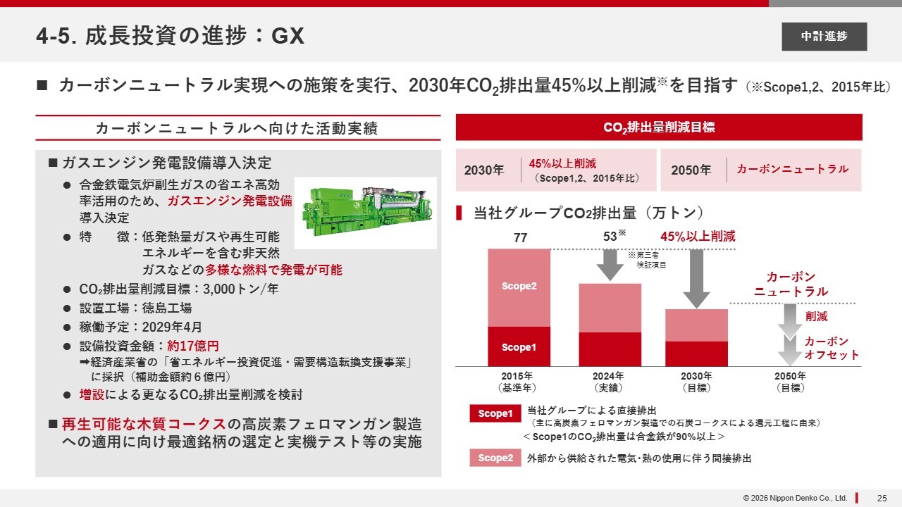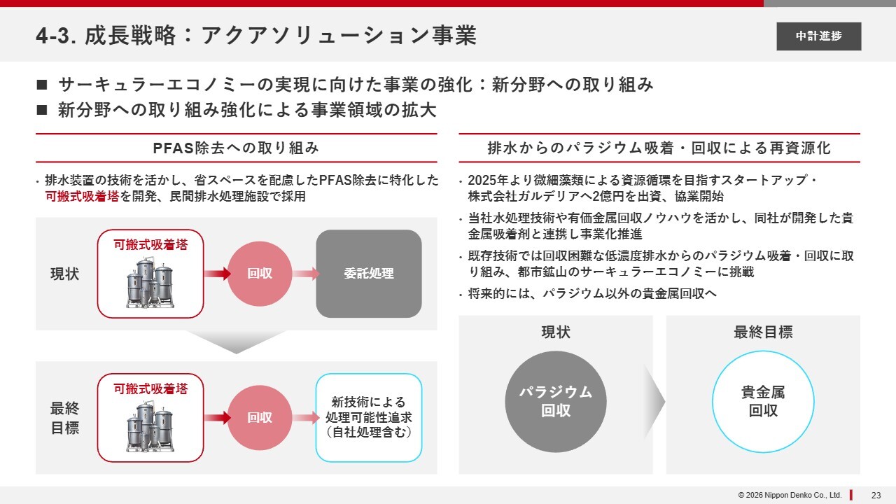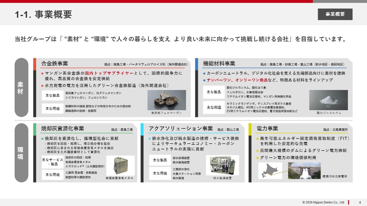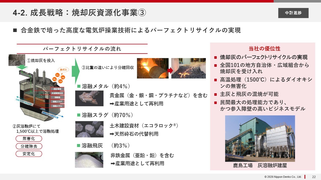 当社は2024年から2027年までの中期経営計画を展開していますが、合金鉄事業は市況の関係で非常に苦戦している一方、それ以外の事業は極めて順調です。特に、焼却灰資源化事業に関しては、2025年11月に大きな投資を行う意思決定をし、順調に進行しています。
