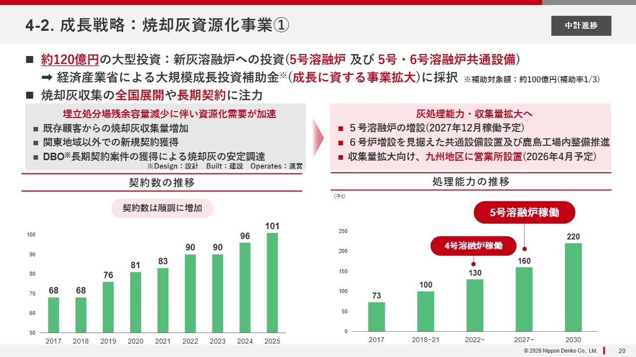 焼却灰資源化事業についてです。2025年11月に発表したとおり、120億円を投じて、現在4基ある溶融炉に加え、5基目の新設を意思決定しました。