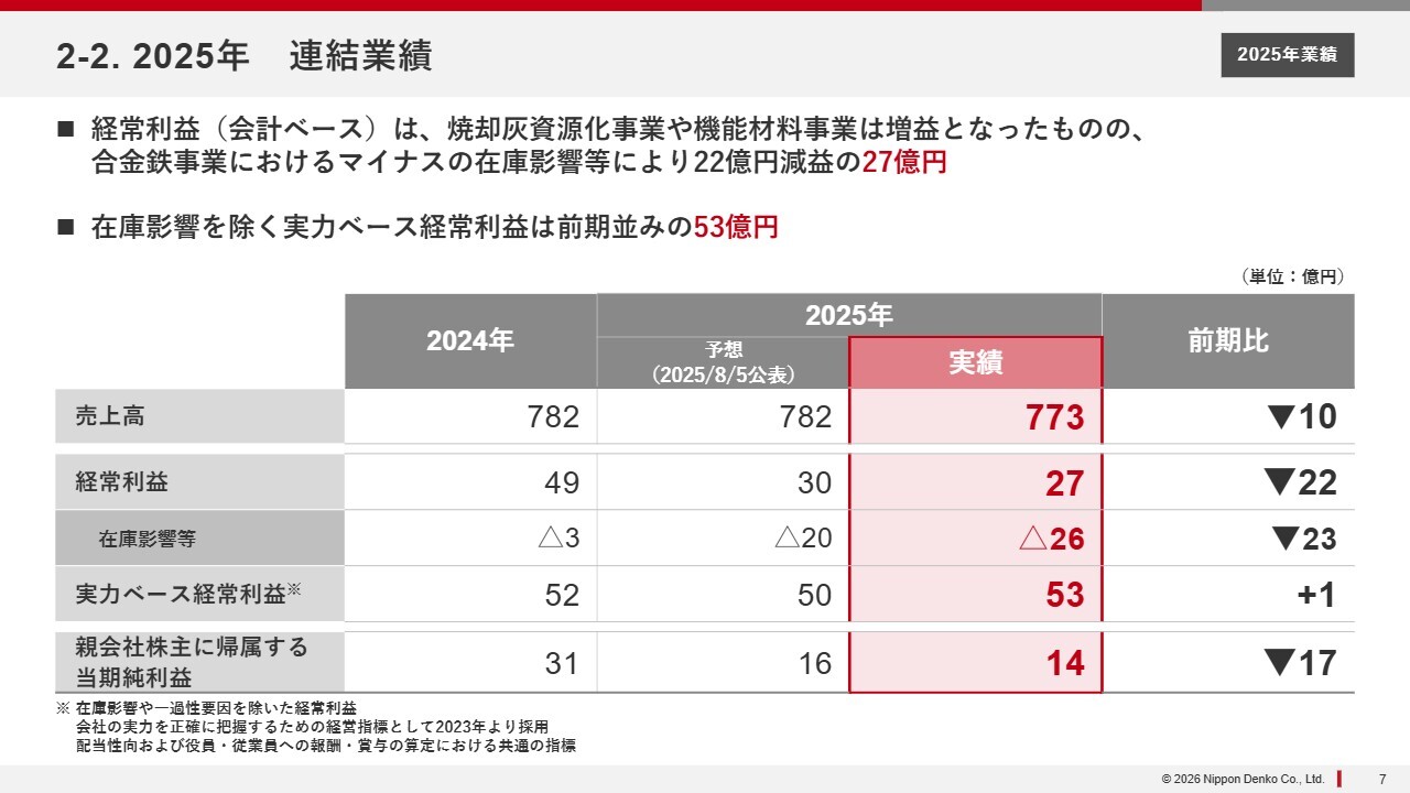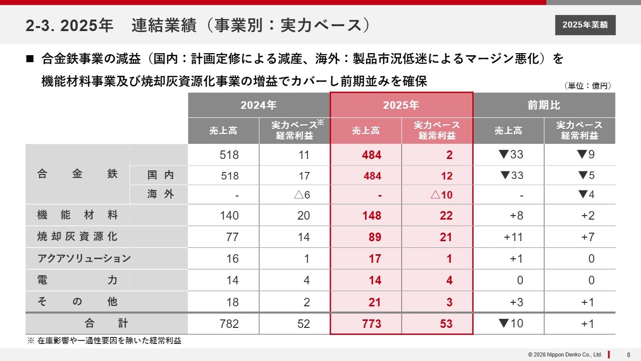 一方、事業ごとに見ると、まず合金鉄事業は、実力ベースで2024年に比べて9億円減少しました。一方で、他の事業、特に焼却灰資源化事業での増益が大きく、全社的にはほぼ横ばいの、実力ベース利益を確保することができました。