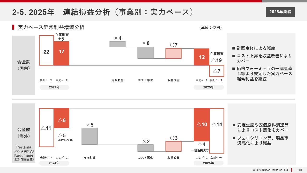 2025年は、国内の合金鉄事業で大規模な定期修理(以下、定修)がありました。炉のレンガをすべて張り替えるという、数年に一度実施するかしないかという大規模な修理であり、これにより稼働率が低下し、4億円の減少要因となりました。