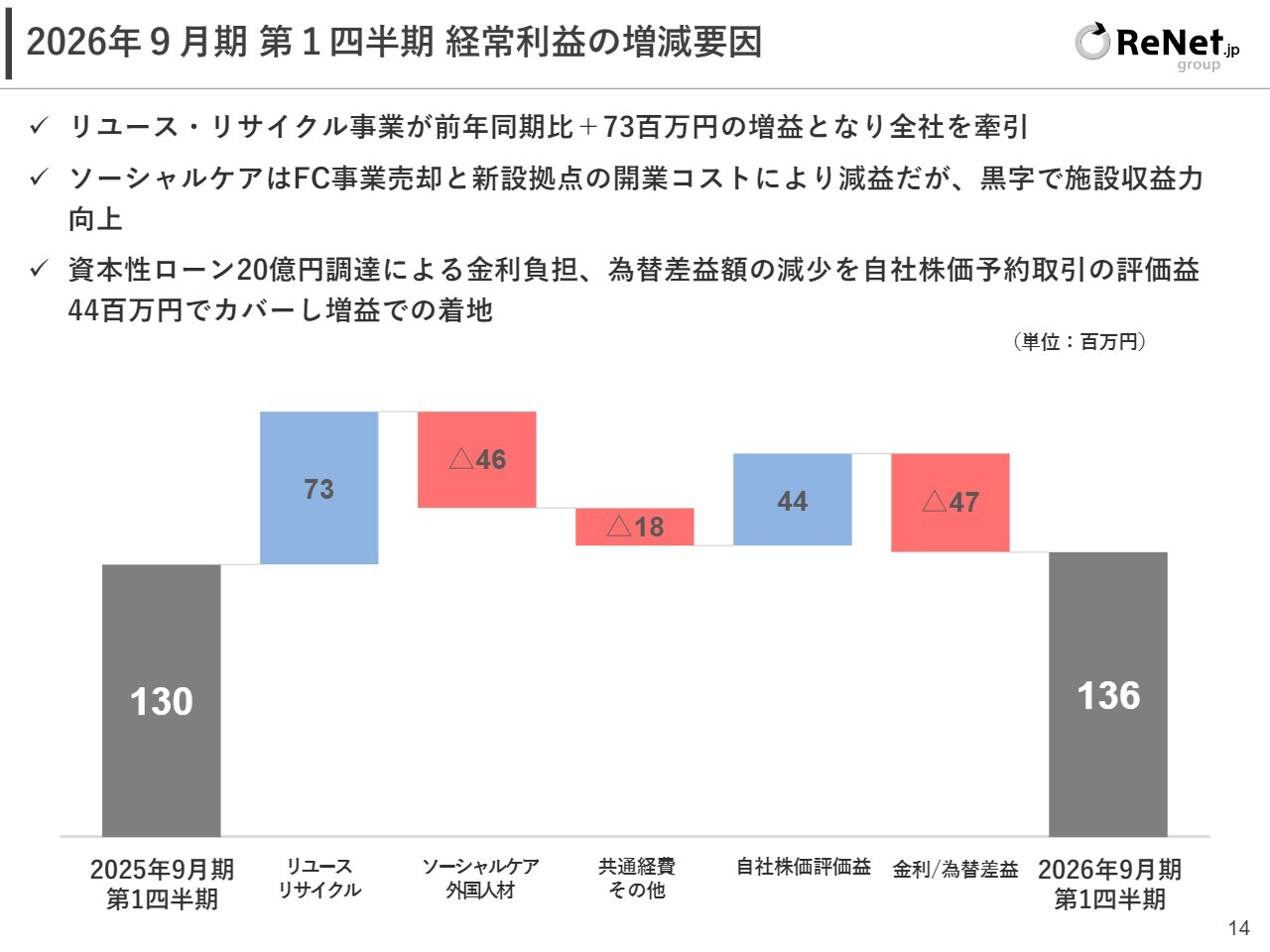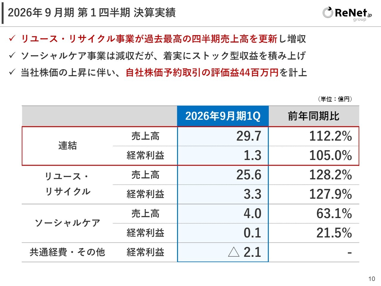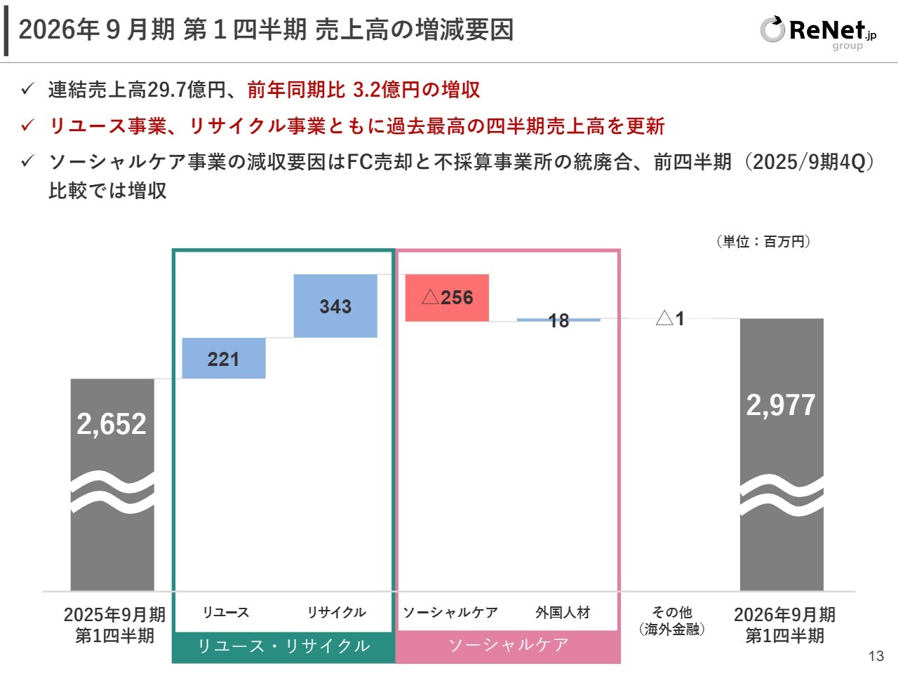 特にリユース・リサイクル事業では、過去最高の四半期売上高を更新し、前年同期比で3億2,000万円の増収となりました。一方で、ソーシャルケア事業は減収となりましたが、これはフランチャイズの本部事業を売却し、不採算事業所を譲渡した影響です。