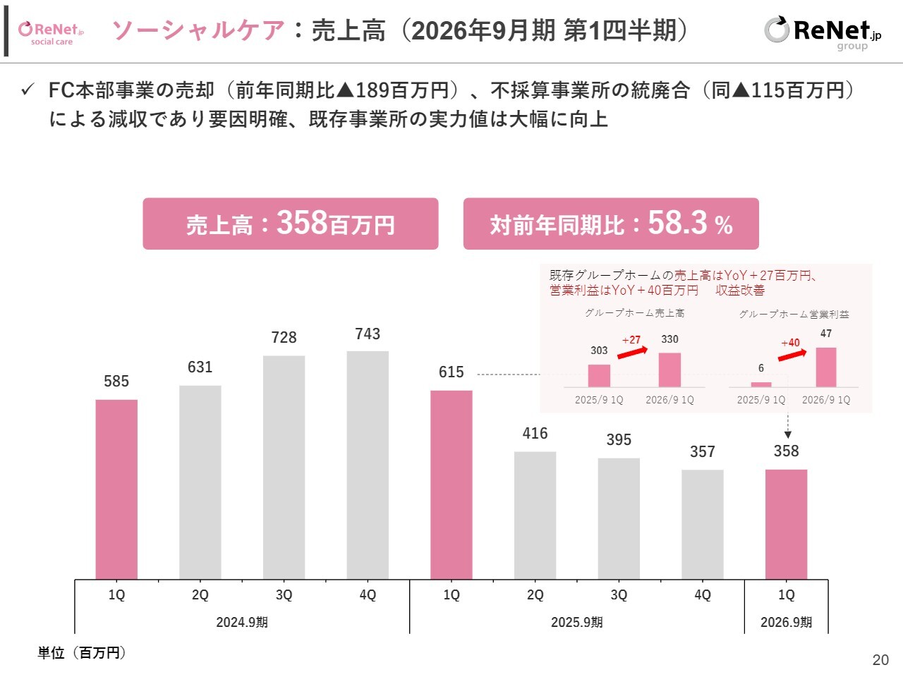 ソーシャルケア事業の売上高は3億5,800万円で、前年同期比58.3パーセントと減収となりました。これは、先ほどお話ししたフランチャイズ本部事業の売却や、不採算事業所の統廃合の影響によるものです。