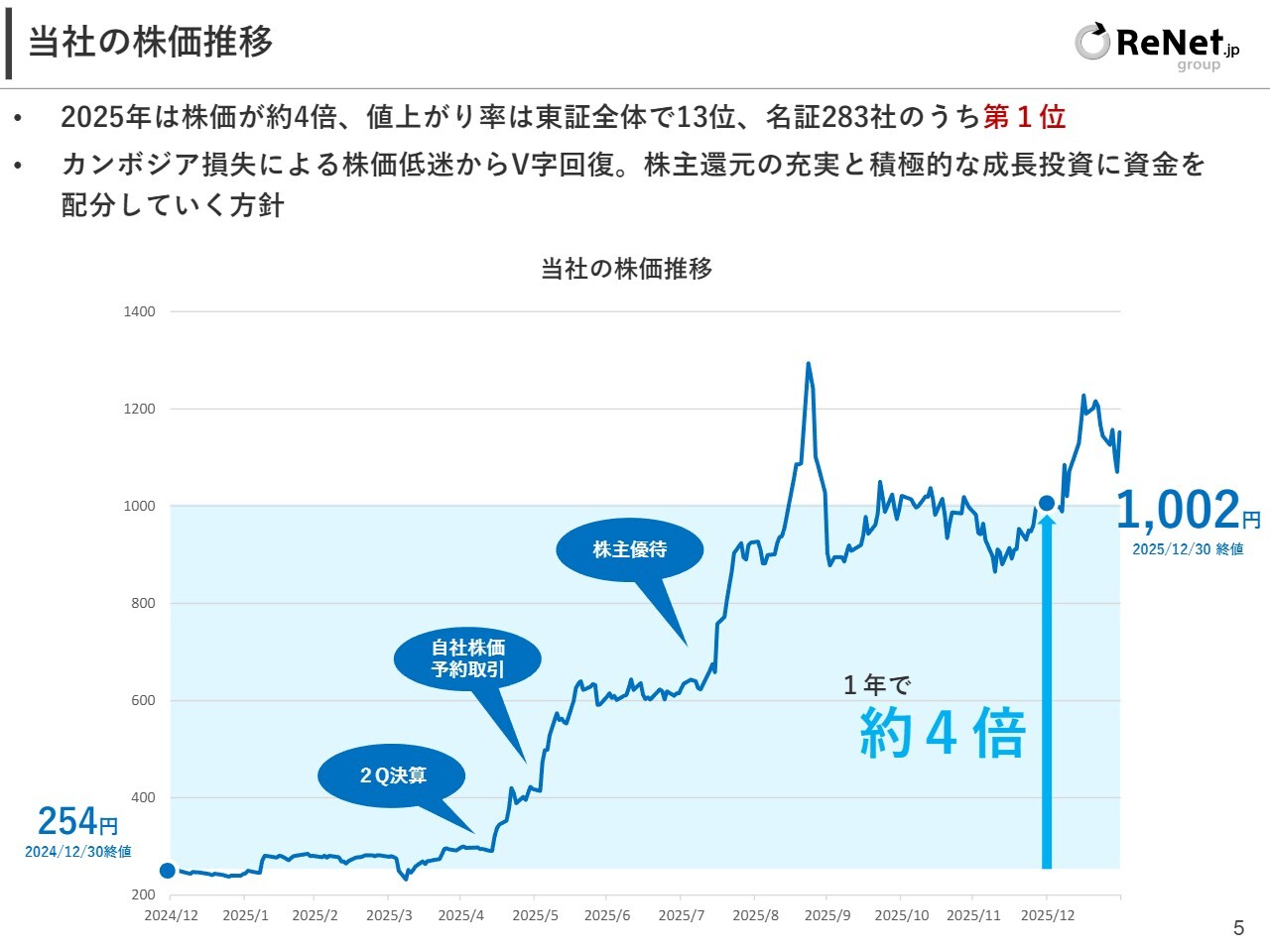 当社の株価推移についてご説明します。スライドのグラフをご覧いただければおわかりのように、この1年で約4倍と順調に株価が上昇しています。2025年1年間の株価の値上がり率では、東京証券取引所の市場全体で13位、名古屋証券取引所では第1位となる株価上昇率を記録しました。足元では、今回の上方修正を発表後も順調に株価が上昇しています。