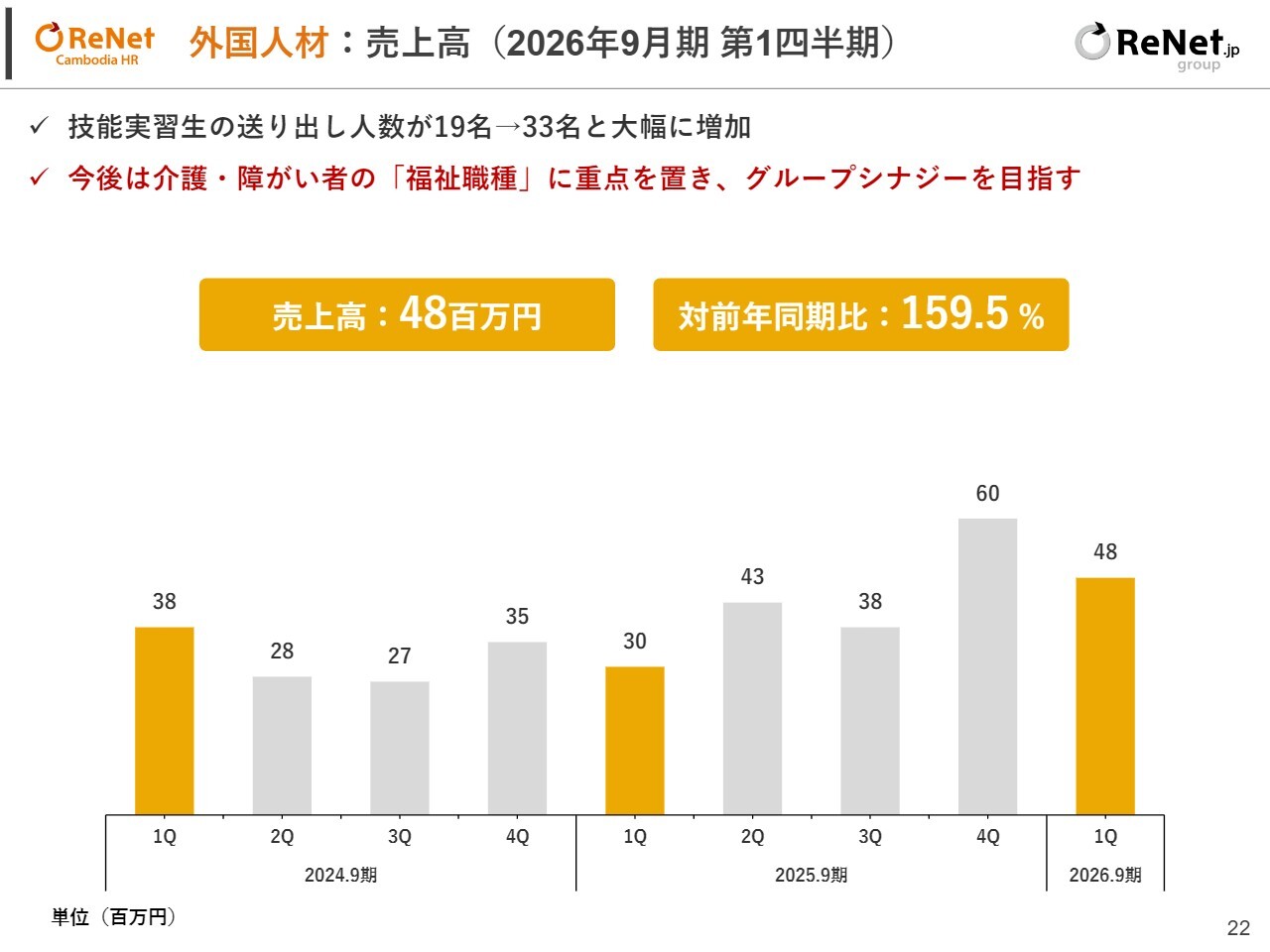 外国人材事業の売上高は4,800万円で、前年同期比159.5パーセントとなりました。売上高自体はまだ小さいものの、159.5パーセントという大きな伸び率を記録しています。今後、グループのシナジーを活かし、介護・障がい者グループホームの福祉職種向けの人材に注力していきたいと考えています。