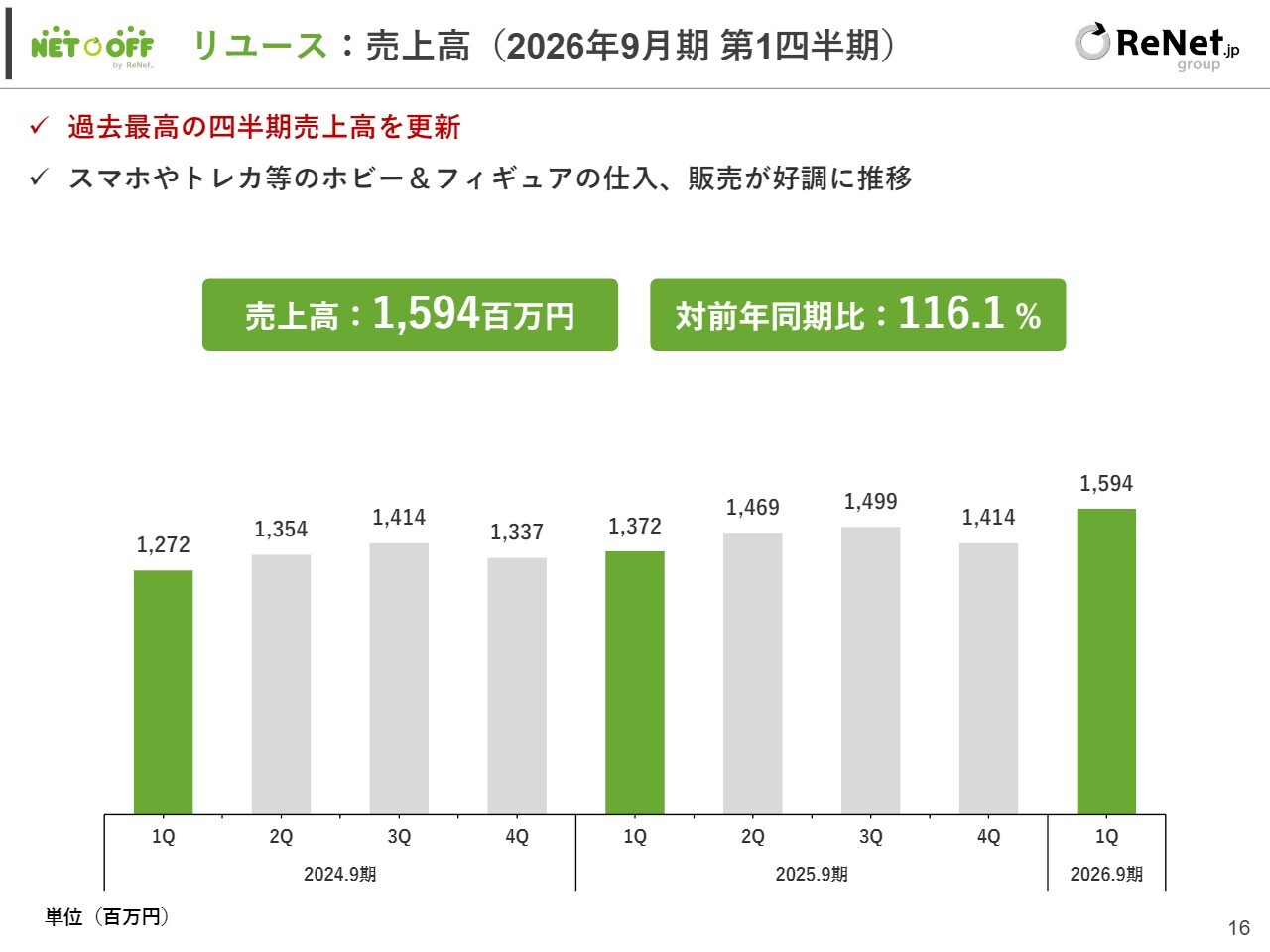 各事業の状況です。リユース事業の売上高は15億9,400万円で、前年同期比116.1パーセントとなりました。創業から25年目の事業ですが、前年より16パーセント伸びています。