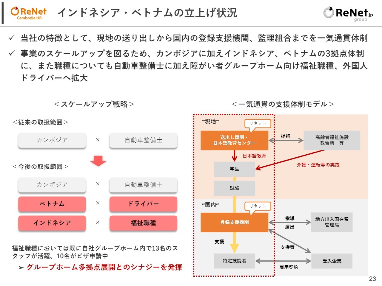 外国人材事業のトピックスです。インドネシアやベトナムも順調に立ち上がっています。スライド右下の図にあるように、リネットジャパングループの特徴は、現地の送出しから国内の登録支援機関・管理組合まで、一気通貫の体制を敷いていることです。