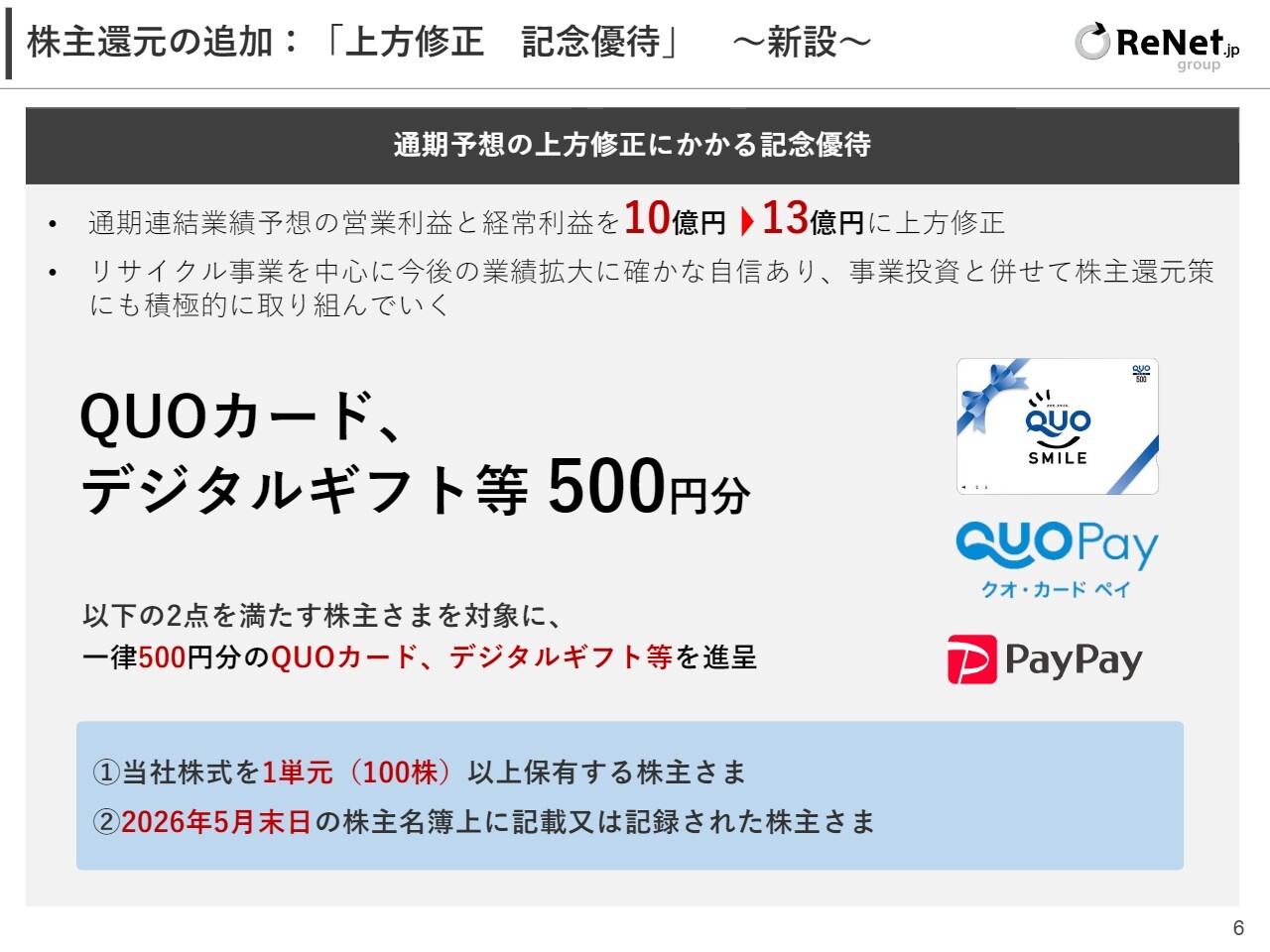 また、2点目として、この上方修正を記念し、株主還元策として「上方修正記念優待」を新設します。対象は1単元(100株)以上を保有する株主さまで、内容はデジタルギフト500円分(一律)です。権利確定日は2026年5月末日となります。